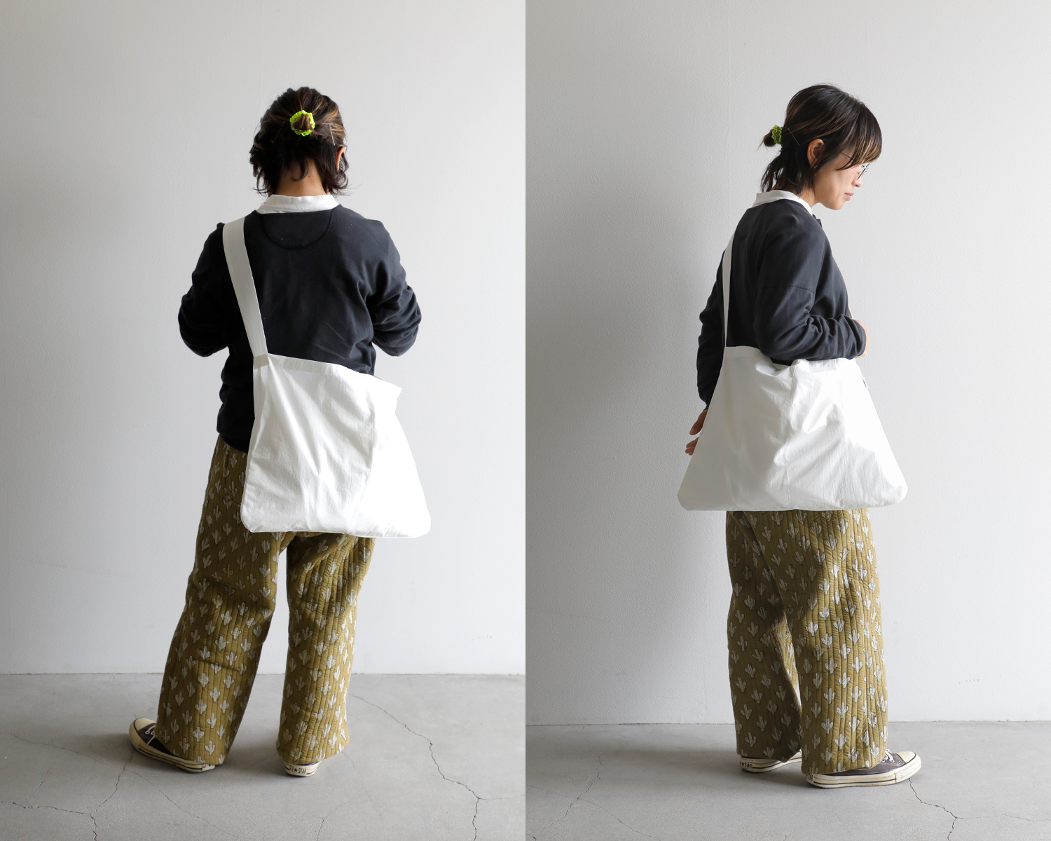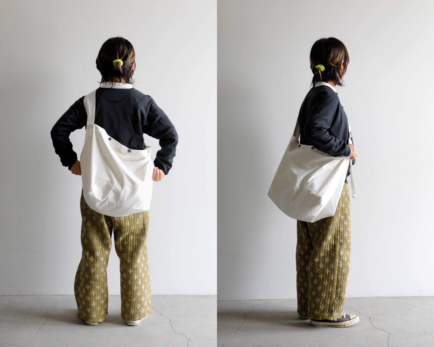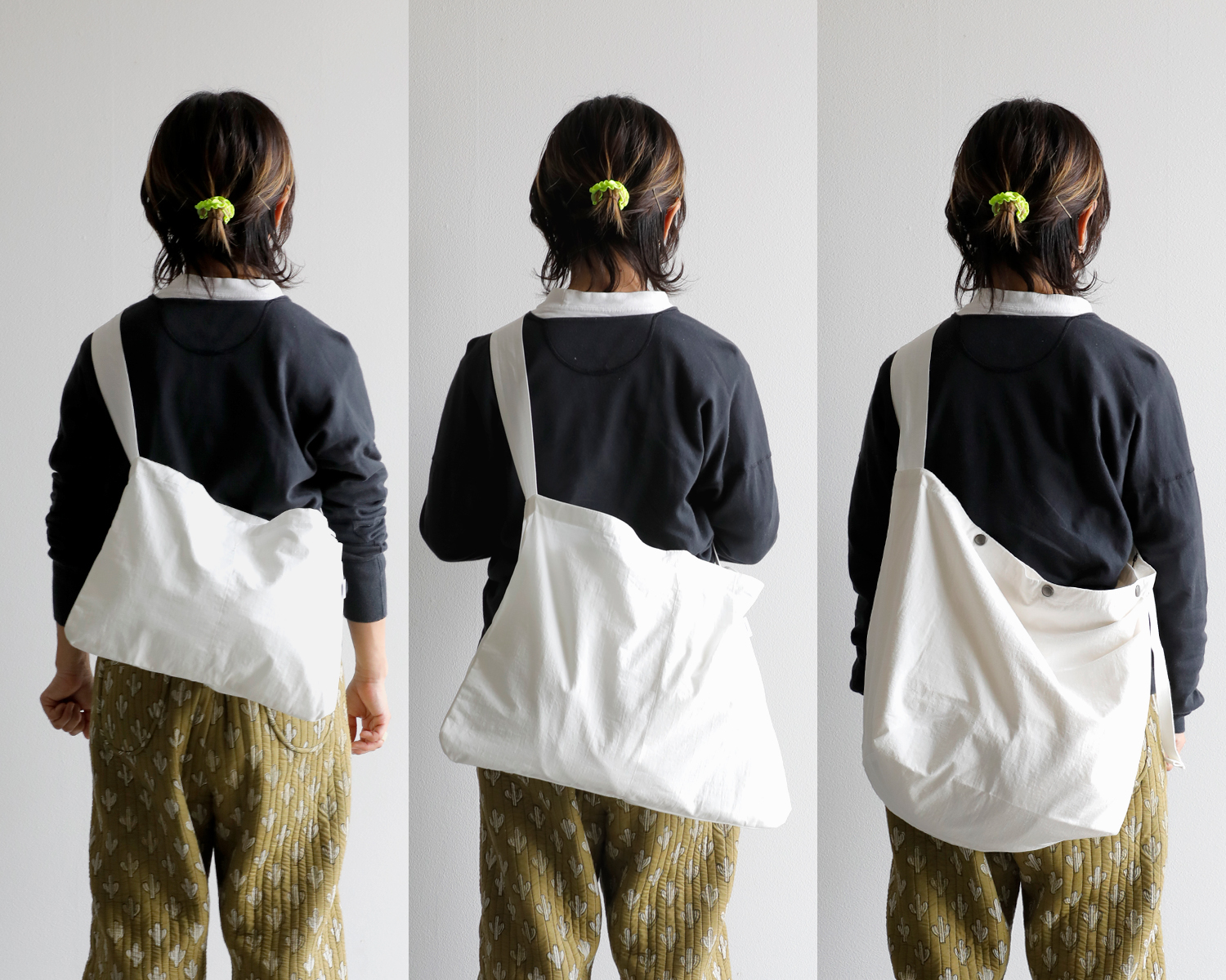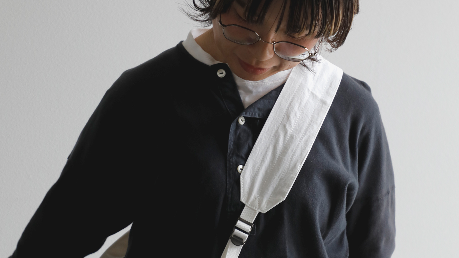 荷物が多めの私は、今回最後に持ったマチ付きのショルダーバッグ [SHOULDER SACK 2.0]を最終的にセレクト。肩にかかる部分が幅広のストラップで、荷物が多い日も肩が痛くなりにくそうなのもポイントです。低身長だと大き目バッグの時に、底に手が届かないことがよくあるのですが、ストラップを一番短くすると、その問題も解消されます。薄着の季節のTシャツやタンクトップの上から斜め掛けした時に、この幅広のストラップと金具が見た目にもよいアクセントになってくれそうで、これから着こなしを考えるのもとても楽しみです!