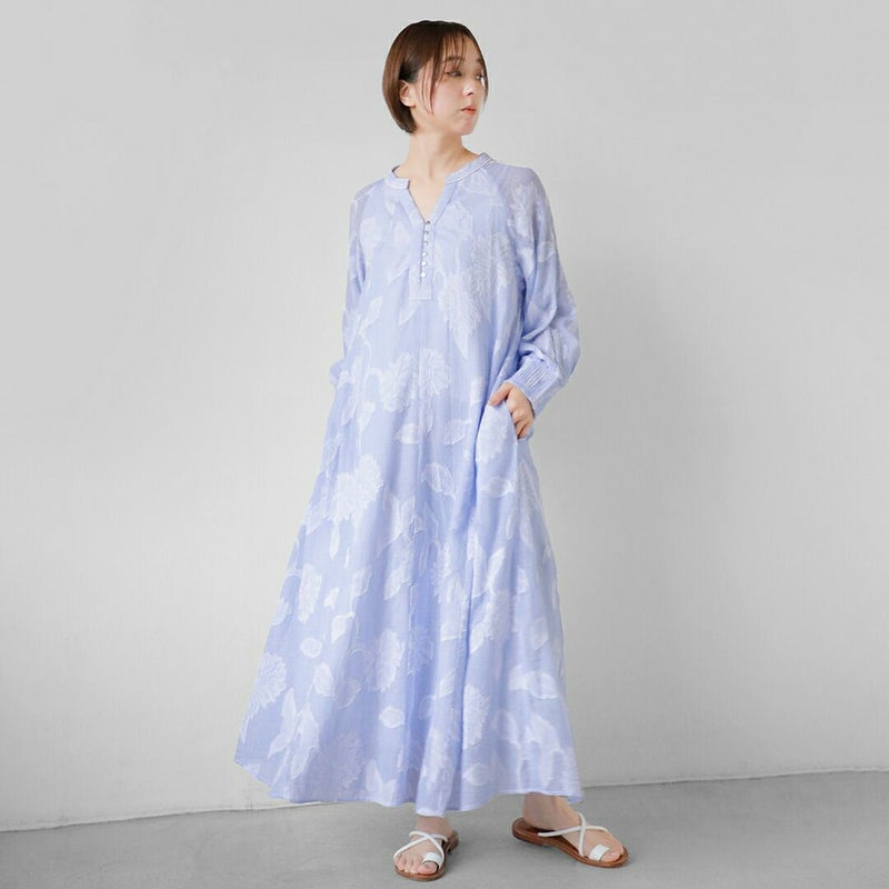 ne Quittez pas(ヌキテパ)より、コットン ストライプ フラワージャガード フレア ドレス Cotton Stripe Flower Jacquard Flare Dressをご紹介します。フラワージャガードとストライプ柄が合わさった、表情豊かなフレアドレス。織りで表現された花柄とストライプが奥行きのある立体感を生み、動くたびに美しく揺れるシルエットが魅力です。コットン100%の軽やかな着心地と、インド製ならではの風合いで、デイリーからお出かけまで活躍。女性らしさを引き立てる、上品で華やかな一着です。