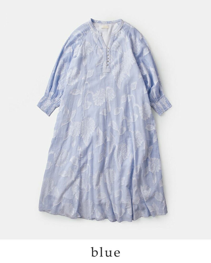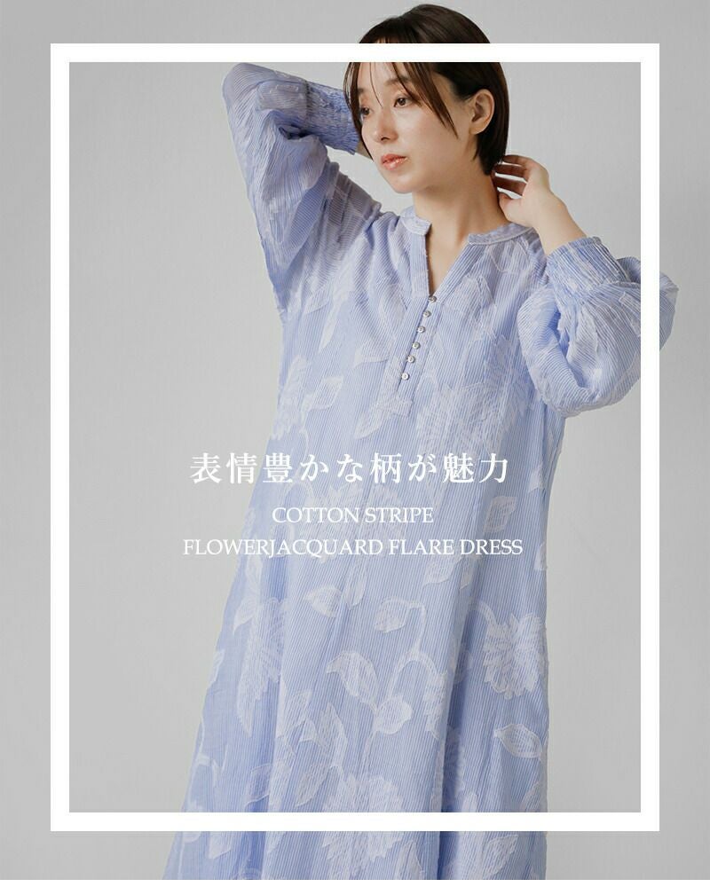 フラワージャガードとストライプ柄が合わさった、表情豊かなコットン素材。さらりとした肌触りで快適な着心地を叶えます。