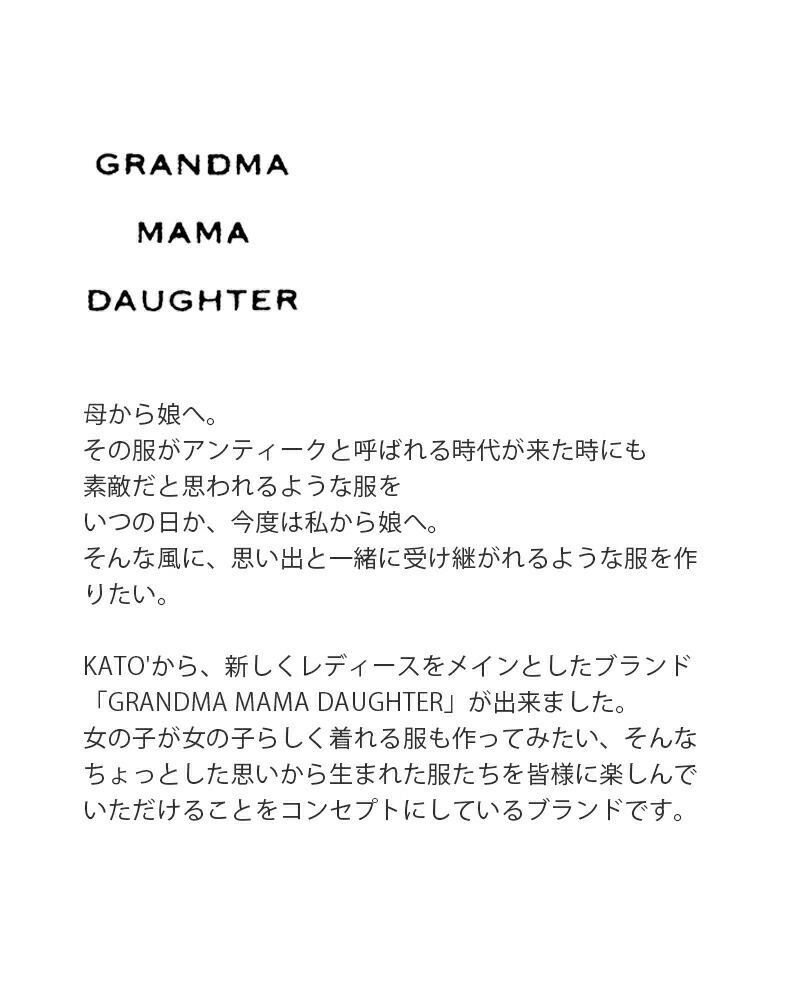 母から娘へ。 その服がアンティークと呼ばれる時代が来た時にも 素敵だと思われるような服を いつの日か、今度は私から娘へ。 そんな風に、思い出と一緒に受け継がれるような服を作りたい。 KATO'から、新しくレディースをメインとしたブランド 「GRANDMA MAMA DAUGHTER」が出来ました。 女の子が女の子らしく着れる服も作ってみたいね、 そんなちょっとした思いから生まれた服たちを 皆様に楽しんでいただけることをコンセプトにしているブランド。
