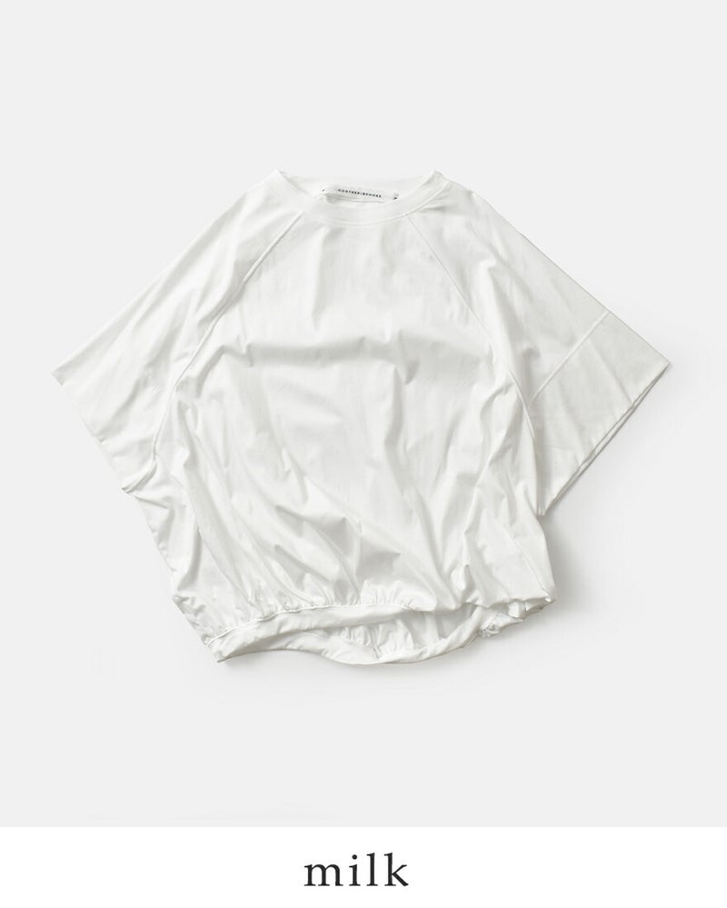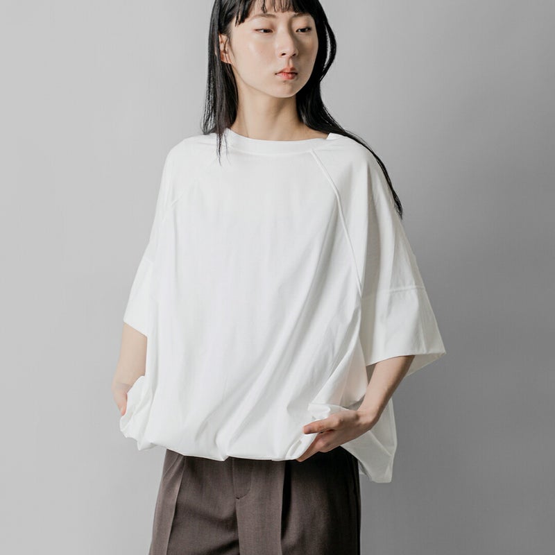 COGTHEBIGSMOKE(コグザビッグスモーク)より、ハイゲージコットン 5分袖 Tシャツ LILLYANA PUFFY SHORT SLEEVE TOPのご紹介です。オーバーサイズのハーフスリーブストップス。やや短めの身頃に二重仕立ての袖と、ふんわりと広がる裾が特徴です。裾リブは内側に折り込まれ、ストッパーでシルエットの調整が可能です。柔らかなフォルムと構造的なディテールが組み合わさった、ユニークな存在感の一着です。