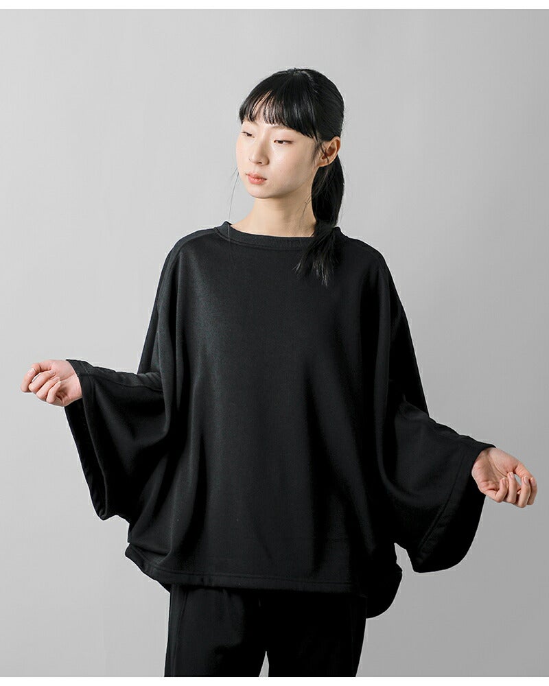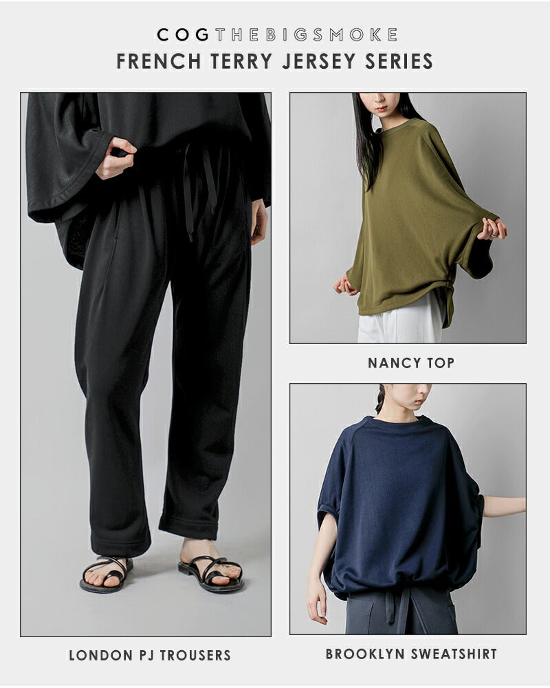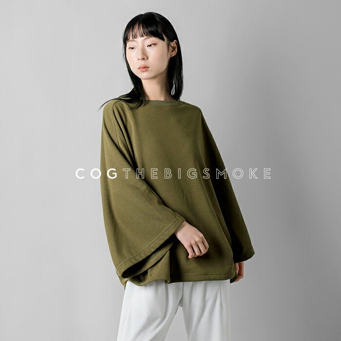 COGTHEBIGSMOKE(コグザビッグスモーク)より、フレンチテリーベルスリーブカットソー “NANCY TOP”のご紹介です。ベルのようにドラマチックに広がる袖と、ヘムラインの両サイドに配されたタックが、柔らかな立体感を生み出します。袖口はしっかりと広がり、動きの中に軽さを感じさせるデザイン。シルエット全体はリラックス感がありながら、合わせ方によってカジュアルにもエレガントにも着こなせる、汎用性の高い一着です。