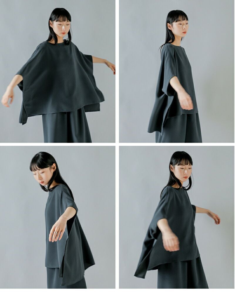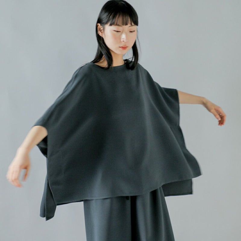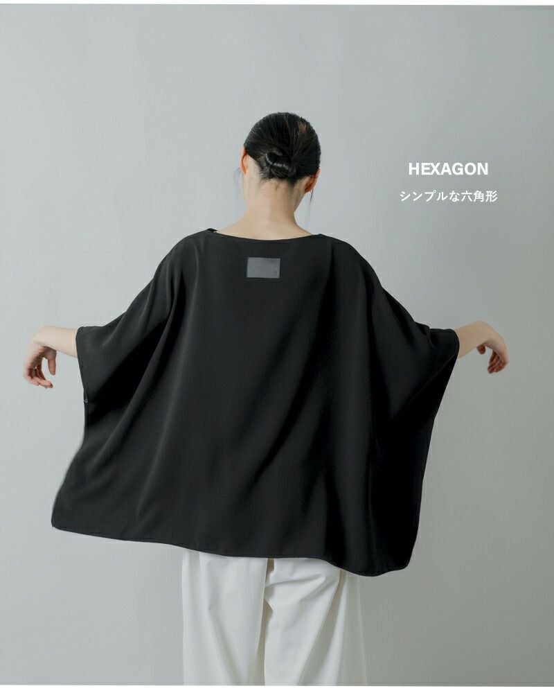 シンプルな六角形のシルエットをベースにしたシンプルな構造ですが、着るとドレープが浮かび、立体的で豊かな表情を見せます。合わせるアイテムによって、デイリーからオケージョンにまで幅広く対応してくれます。