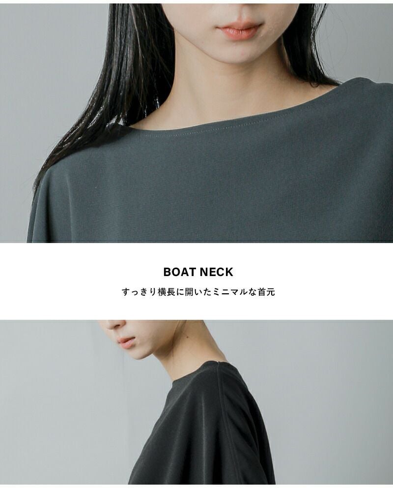すっきり横長に開いたボートネックの襟ぐりは女性らしい雰囲気。