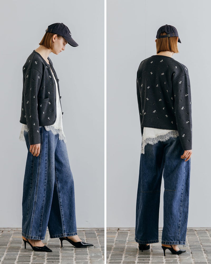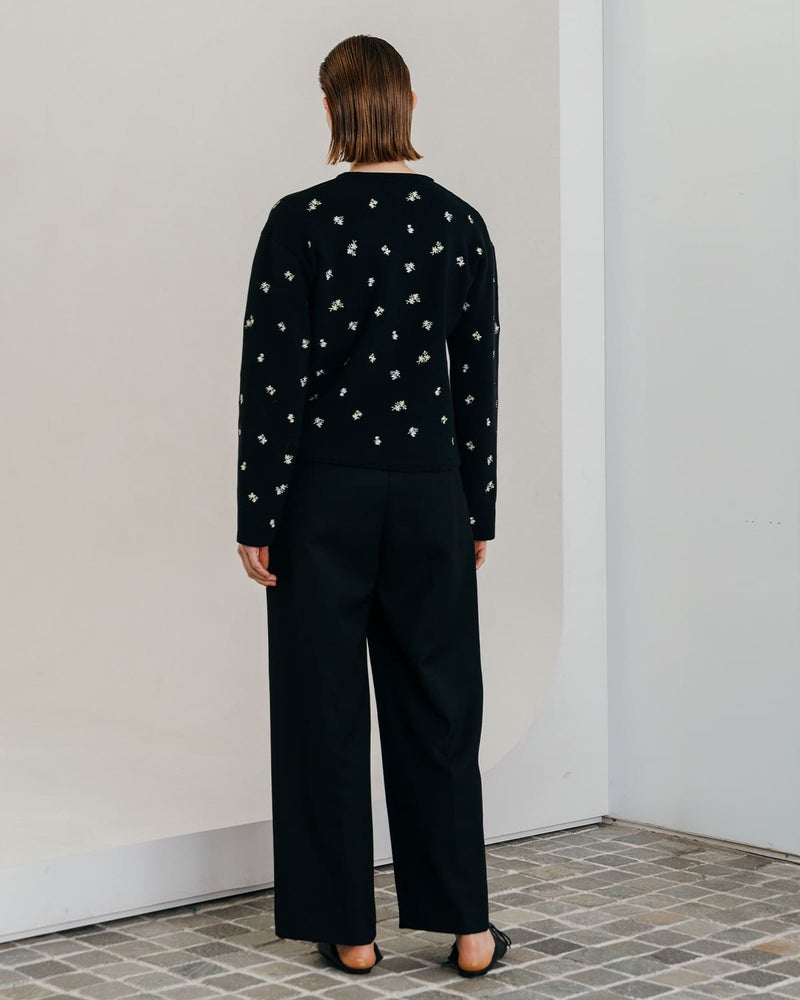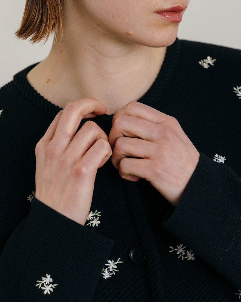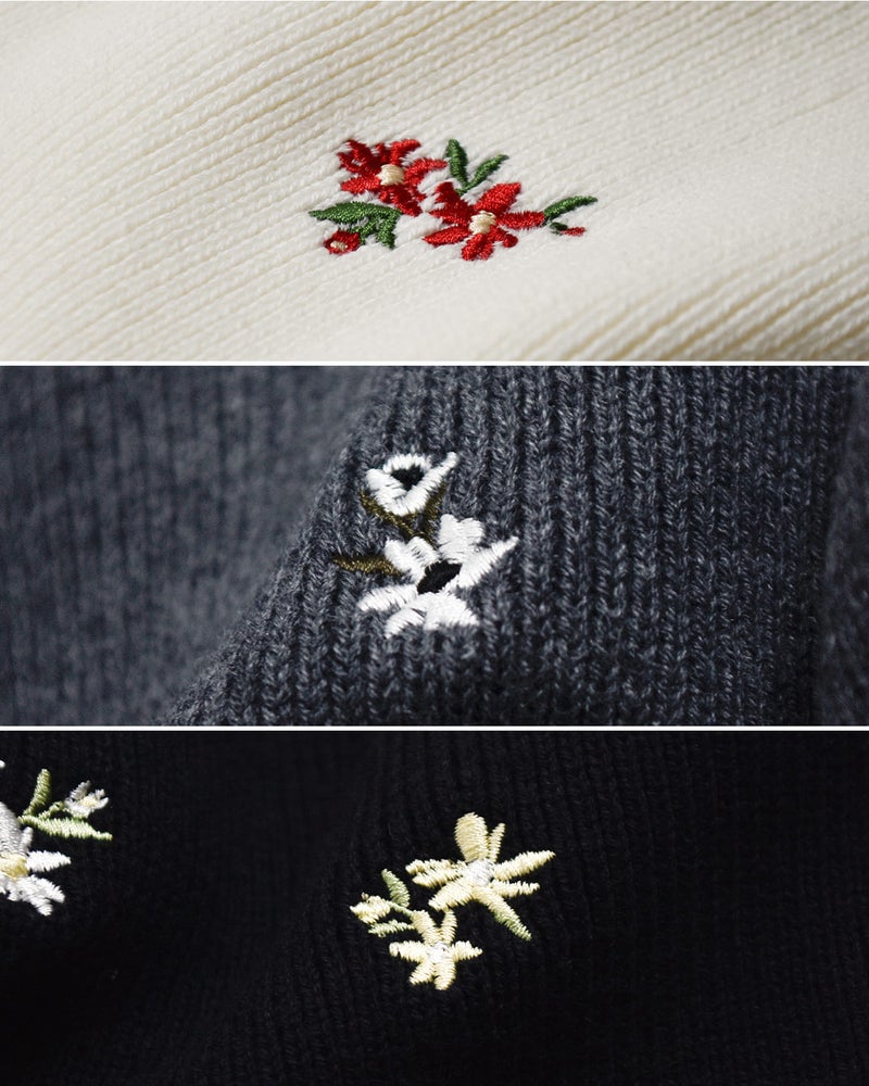 小花刺繍による華やかさと、ニット素材ならではの柔らかさをあわせ持った雰囲気。