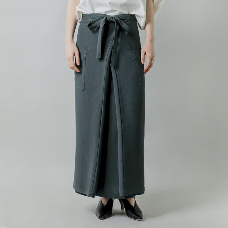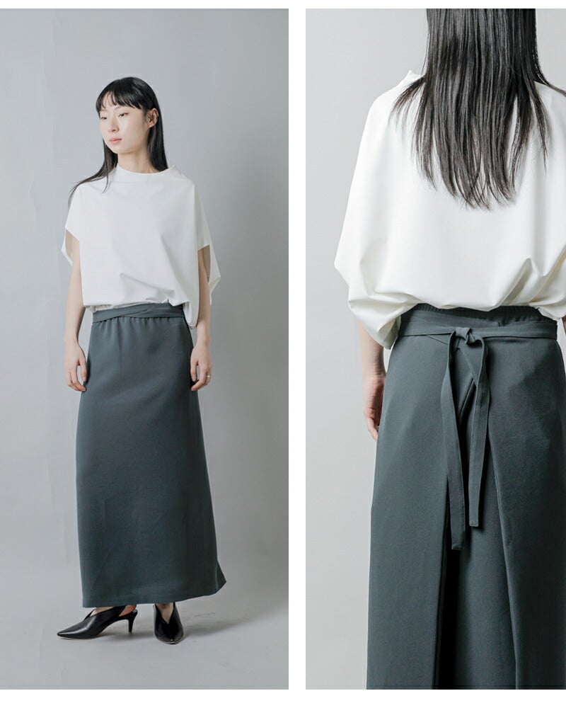 このスカートの特徴は巻き方によって表情を変えられる点。ラップを重ねる側はプリーツスカート風に、重ねない側はすっきりしたペンシルスカート風のシルエットに。ミニマルな中に、着方によるニュアンスの違いを楽しめる一着です。