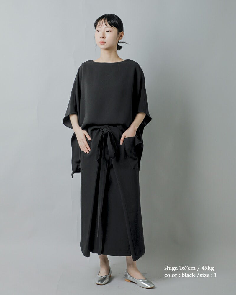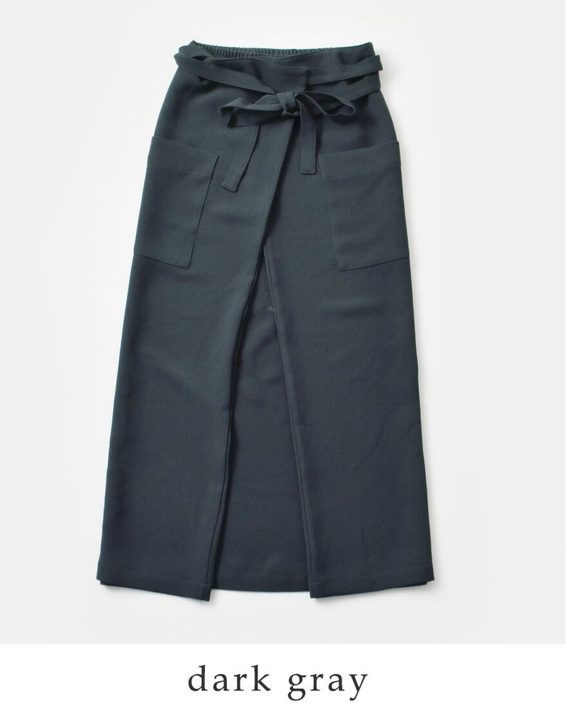 ストンとした縦のラインが美しいストレートシルエット。ラップの重ね部分を調節することでシルエットの微調整が可能です。両サイドの大きめのパッチポケットが機能性とデザイン性を高めます。
