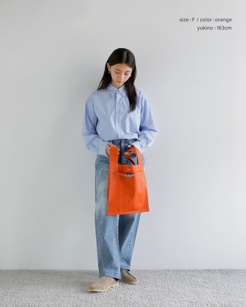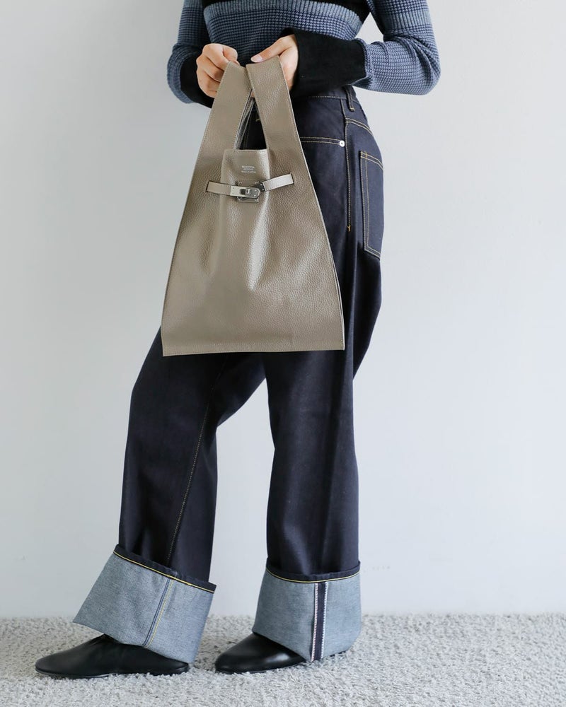 ありふれたマーケットバッグの形に、上質なイタリア製シュリンクレザーと、アイコニックな金具を組み合わせたのラージマーケットバッグ。