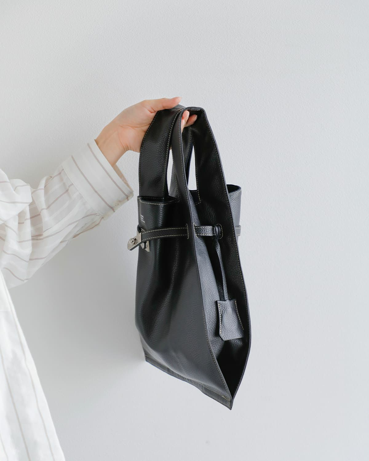 ありふれたマーケットバッグの形に、上質なイタリア製シュリンクレザーと、アイコニックな金具を組み合わせたのラージマーケットバッグ。