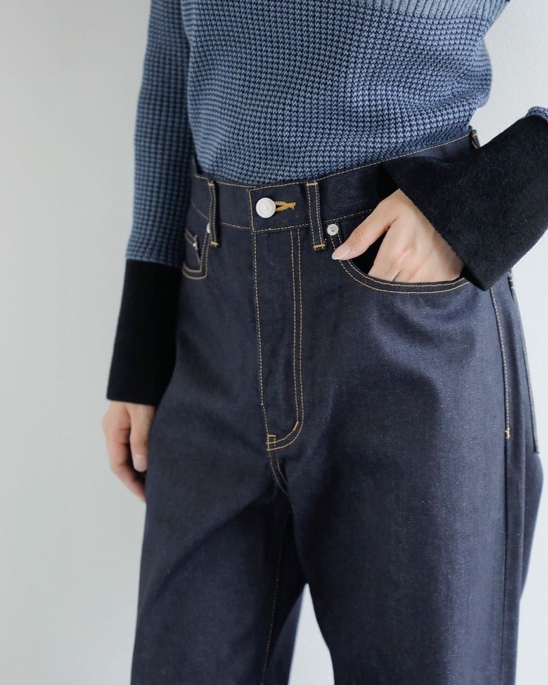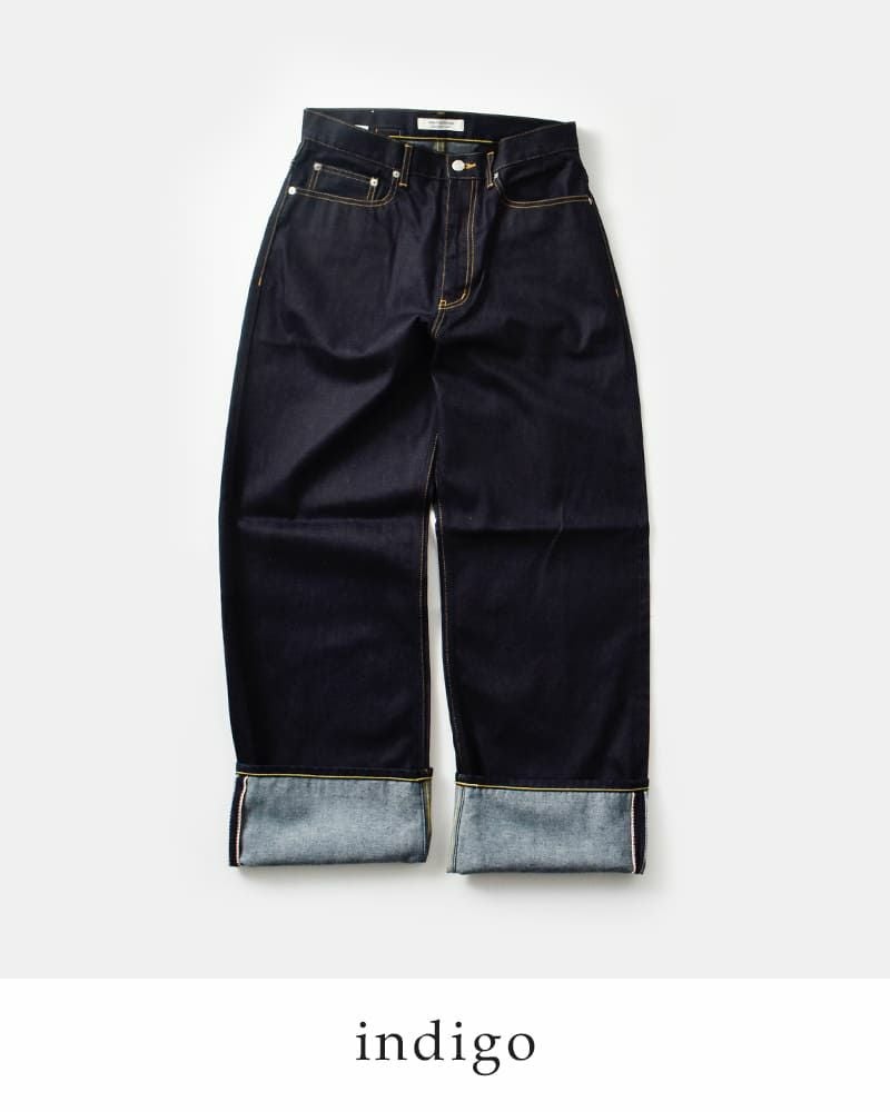 ワイドなシルエットにクラシックな5ポケットデザインなどを落とし込んだ、モード感漂う一本。ややローウエストでヒップまわりにゆとりをもたせ、膝から裾にかけてまっすぐ落ちるワイドストレートが美しいバランスを演出します。長めの丈感は大胆なターンアップで魅せる仕様に。右腰に配置されたビッグサイズのネームタグはスタイリングのアクセントに。後ろベルト下にはシンチバックルを配置し、ヴィンテージのような空気感もプラス。細部にまで宿るこだわりが、日常を特別に変えてくれる一本です。