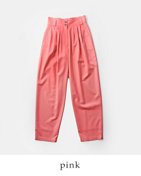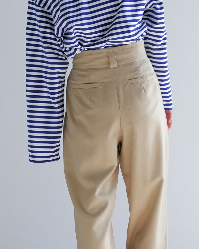 太めのベルトデザインがポイントのテーパードパンツ。 フロントにタックを入れ、腰回りはゆったりとしたサイジングに仕上げました。 オンオフ問わず幅広いシーンで着用出来る、大人女子におすすめのパンツです。