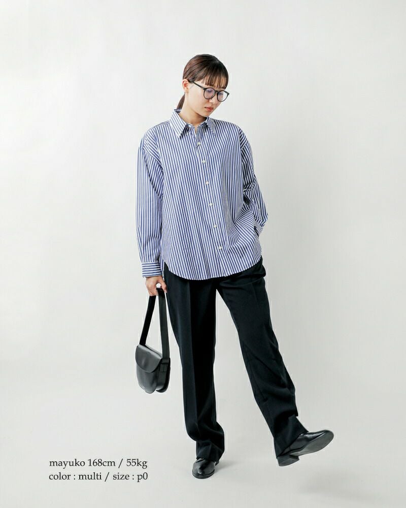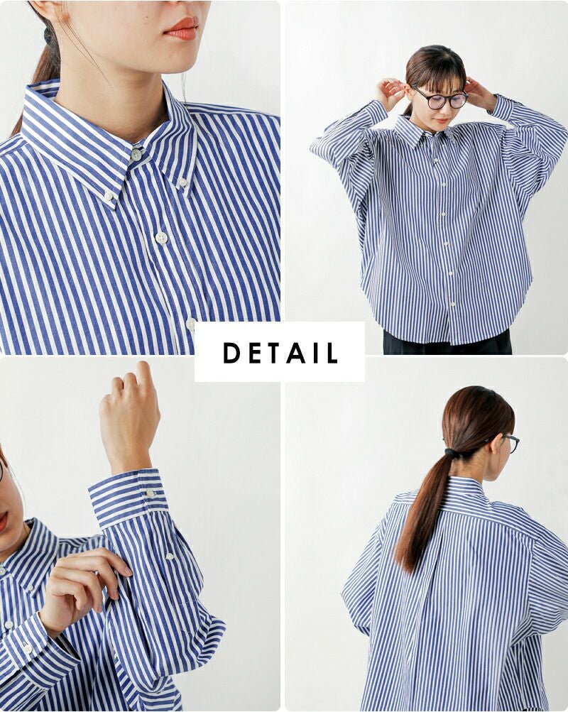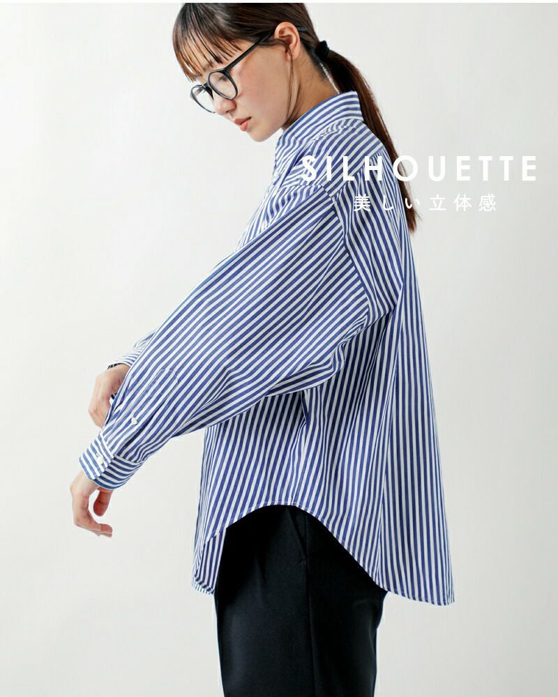 コットン100% さらりとした綿100%の生地。高密度の織りで、ほのかな光沢感があり、上品さを感じます。柔らかさがあって、普段使いがしやすく、デイリーユースにぴったり。通年素材で、重ね着次第で長いシーズン着ていただけます。ストライプは細めのピッチでカジュアル過ぎないデザイン。