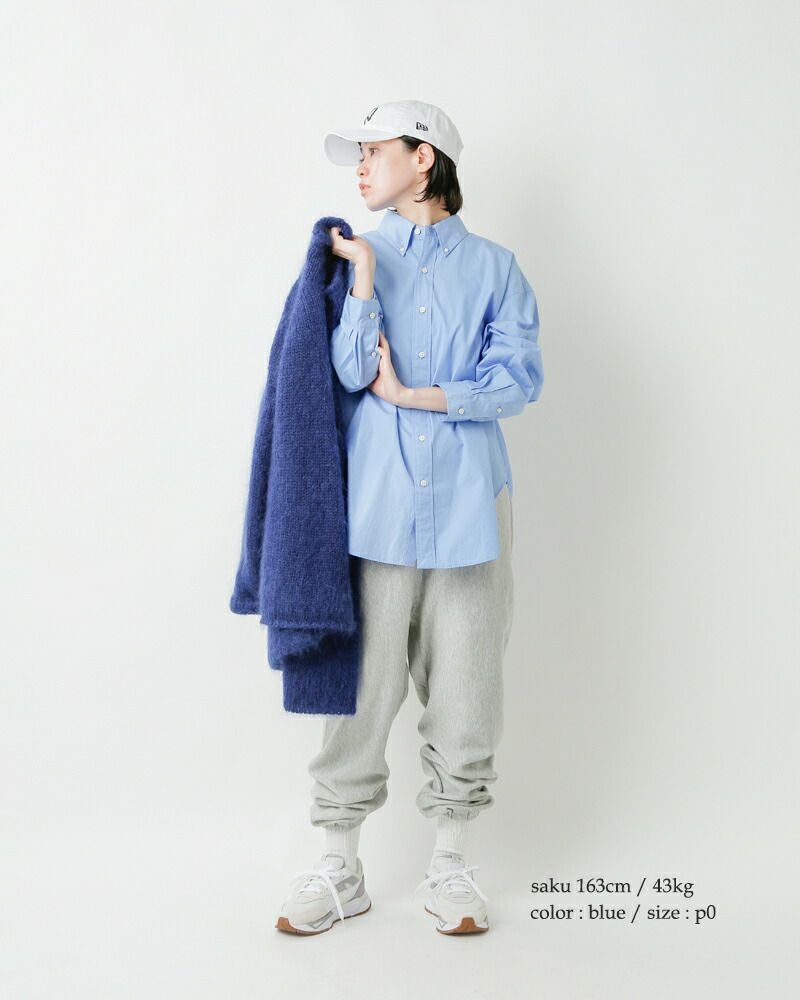 襟はオーセンティックなボタンダウン。襟の幅を大きめに取り、首周りにゆとりを持たせているので、抜け感が出ます。スウェットやニットのインに着た時に、お顔周りのポイントになるのも◎。襟についたボタンは小さめで、カジュアルさが控えめになります。また、カフスも丁寧なつくりでタックを付けてふんわりとしたお袖を絞りこみ、2個のボタンを配置しています。裾はラウンドカット。ボトムスからアウトで着た時も野暮ったさがなく、まとまりのあるスタイリングが出来ます。