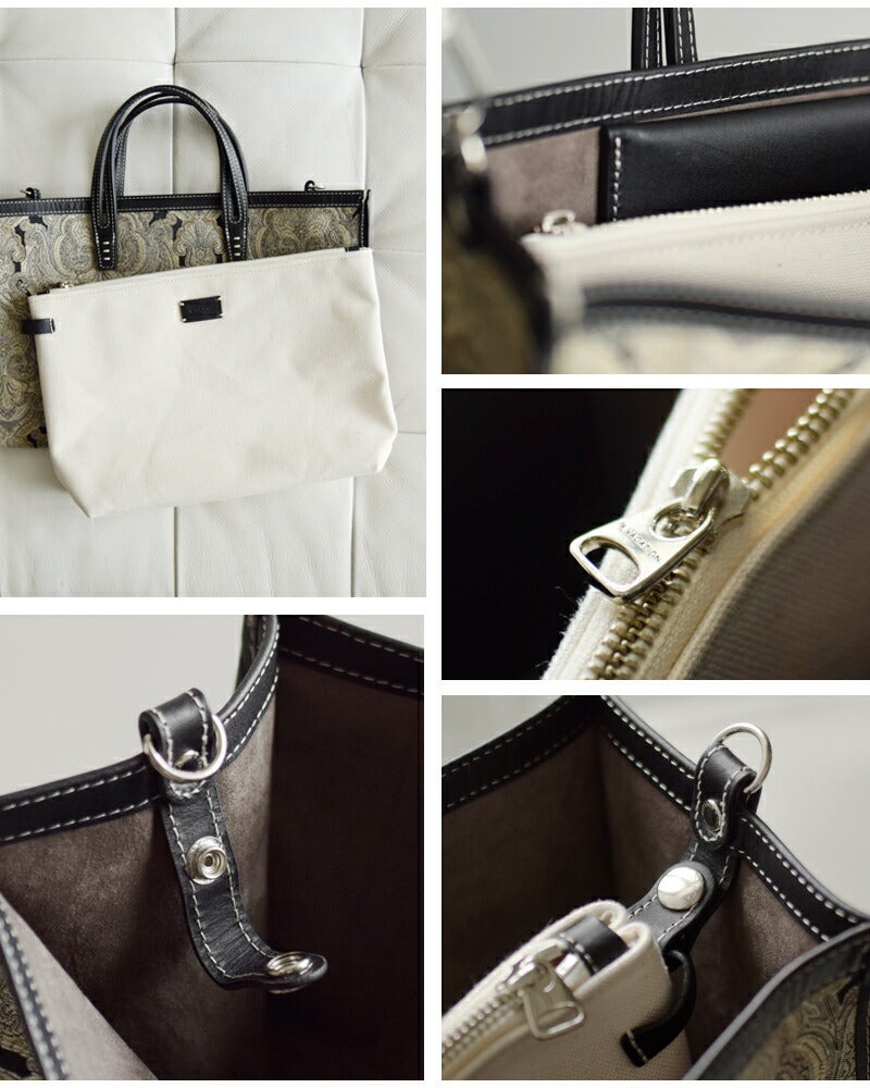 ●大きく開く開口部は中のものが取り出しやすく、中の荷物が収納しやすいです。 ●内側には取り外し可能なポーチがあり細かな荷物を収納することが可能です。 ●バッグに付いたスナップボタンでしっかりと装着ができます。