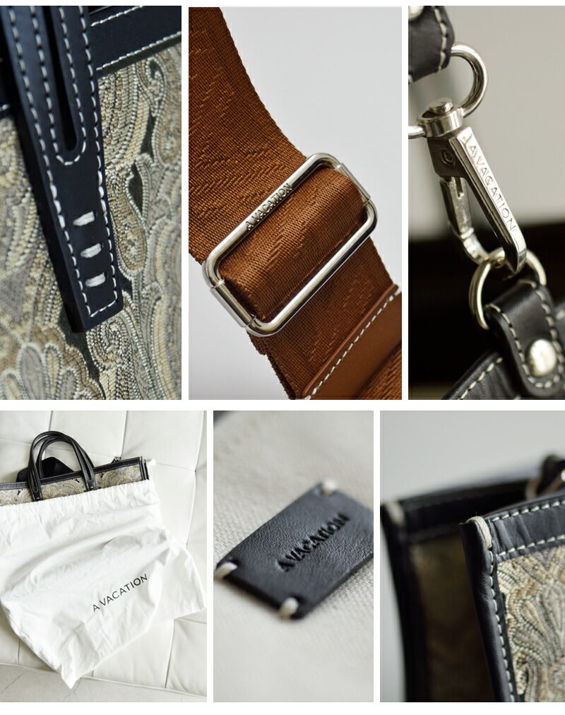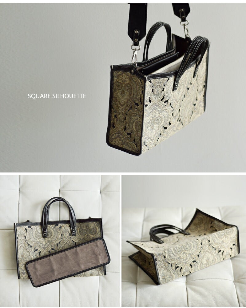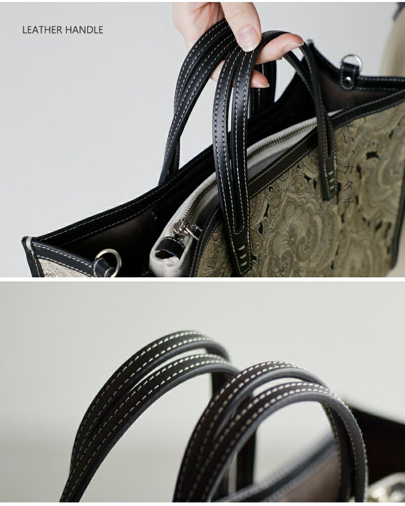 上質かつ品の良さを後押ししてくれる、牛革のハンドルとトリミング。女性の手でも持ちやすいよう、二股にくり抜き細く仕上げたハンドルも特徴です。牛革の丁寧なトリミングと、細やかなステッチに、つくりの良さを感じます。