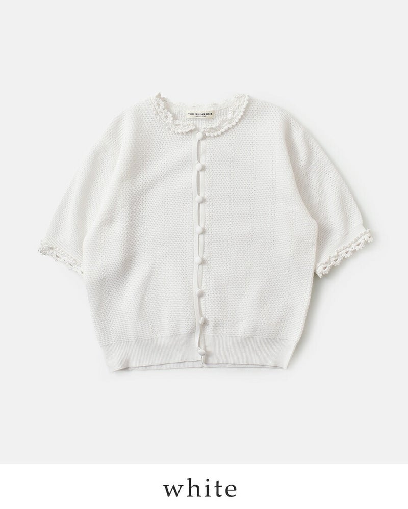 透け感のある繊細なレース編みが、軽やかで涼しげな印象を与える一枚。ふくらみと弾力のある糸を使用することで、コンパクトなサイズ感ながらも、立体感のある美しいフォルムに仕上げられています。
