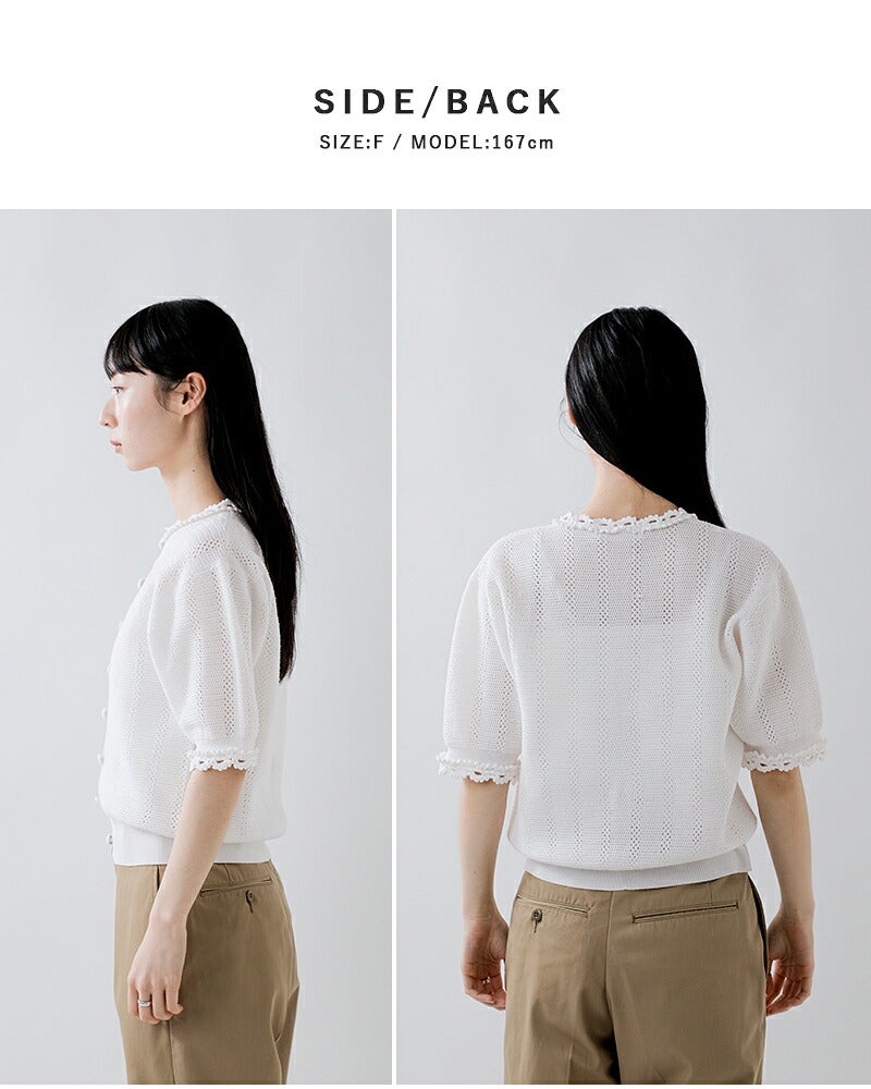 襟ぐりと袖口には、手編みのかぎ針モチーフレースをあしらい、さりげなく華やかさをプラス。ディテールまで丁寧に作り込まれたデザインが、大人の上品さを引き立てます。羽織としてはもちろん、ボタンを留めてトップス感覚で着用できる汎用性の高さも魅力。デイリーからきれいめなスタイリングまで幅広く活躍します。