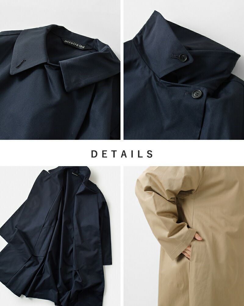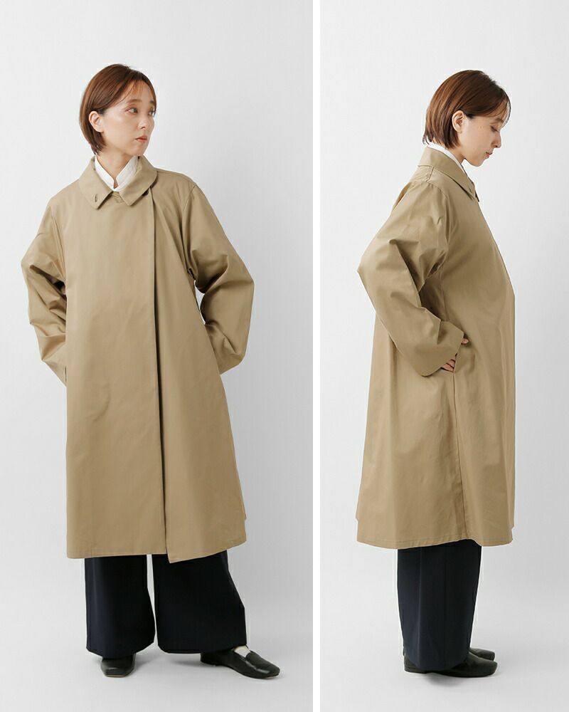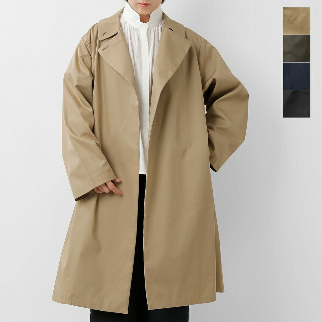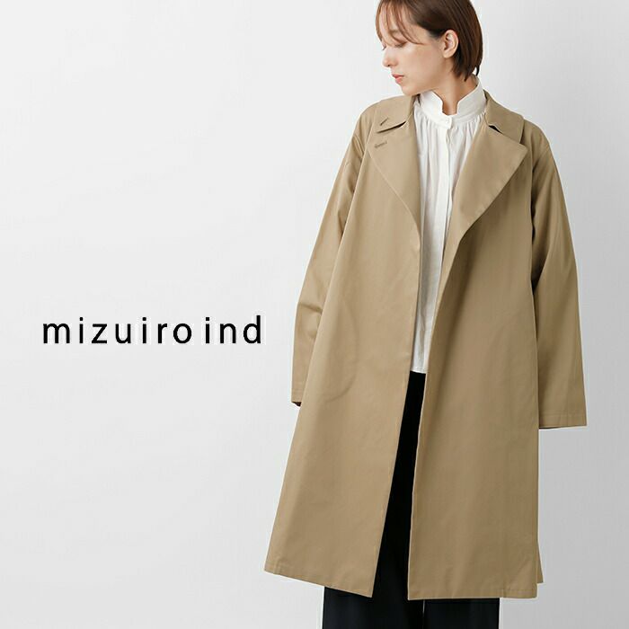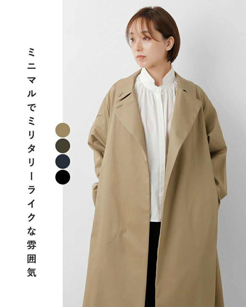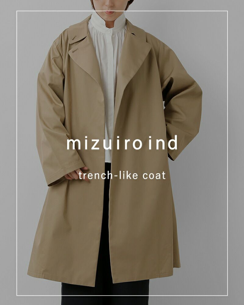 mizuiro ind(ミズイロインド)よりコットン トレンチライク コートのご紹介です。ハリとコシのある生地で作られたトレンチライクコートです。一枚仕立てなので軽やかに仕上がっています。ミニマルでミリタリーライクな雰囲気もあり、すでに在るようで無いコートを表現。襟元はボタン留めで立てて着用可能。4色のカラー展開はベーシックで揃え、極限までシンプルに、トレンチコートをベースに長く愛用していただけるよう拘りを持ってデザインされています。季節の変わり目、気温の変化にすぐに対応できる今季お勧めの1枚です。