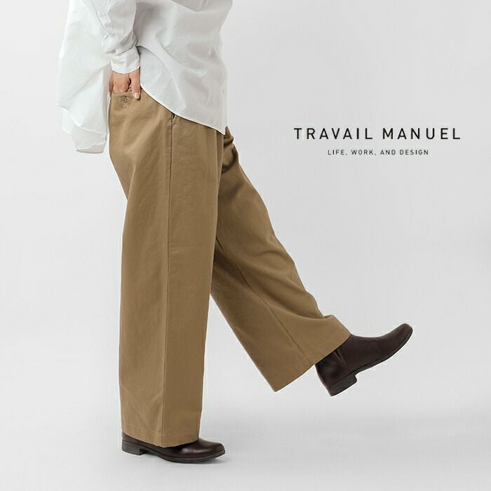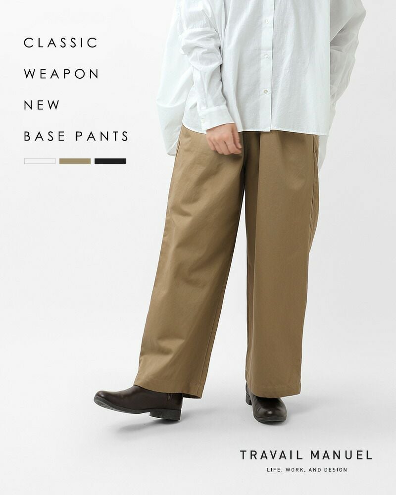 TRAVAIL MANUEL(トラバイユマニュアル)よりクラシック ウエポン ニュー ベース パンツのご紹介です。程よいボリューム感のあるきれいなワイドシルエットが穿きやすい、スタイリングに大活躍のイージーパンツ。股上を深くしすぎず、スラッとしたラインが出るようなワイドストレート。 ワイドながらもダボッとルーズにならず、きれいなシルエットでご着用いただけます。定番アイテムとして気兼ねなく使えて、さまざまなトップスと合わせられます。ブラウスともカットソーとも、冬にはニットとも合わせやすく、ロングシーズン大活躍の一本です。