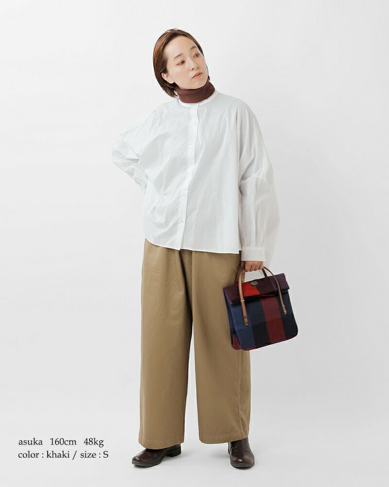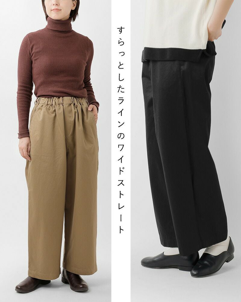股上を深くしすぎず、スラッとしたラインが出るようなワイドストレート。 ワイドながらもダボッとルーズにならず、きれいなシルエットでご着用いただけます。キレイ目の靴と合わせたコーデで上品さをプラスしても◎。