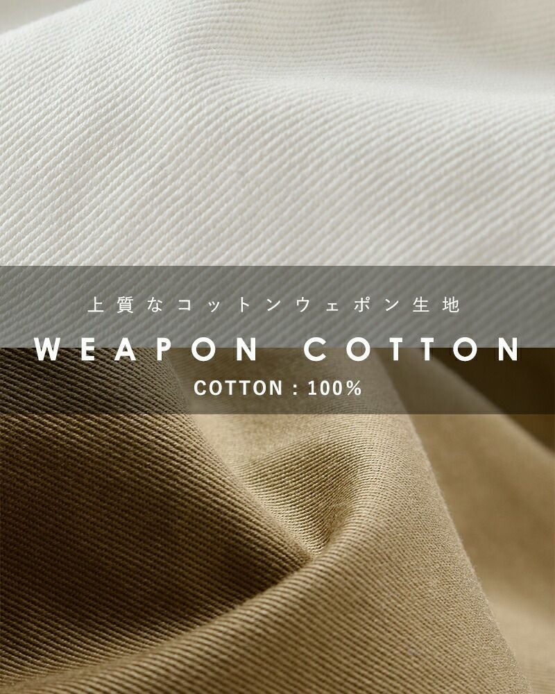 一般的なチノクロスよりしっかりとしていてしなやかなウエポンコットンを使用。加工で馴染んでいて穿きやすく安心感があります。程よい厚みの生地は通年使えて、柔らかな光沢のある生地は上質な見た目に。穿いていくほどにより柔らかく馴染んでいきます。