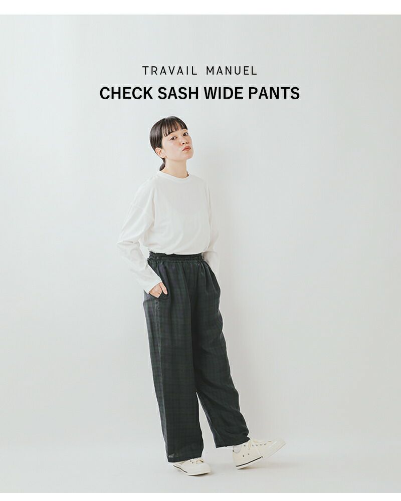 TRAVAIL MANUEL(トラバイユマニュアル)より、チェック サッシュ ワイド パンツのご紹介です。さらりとした生地感で動きやすい、ゆったり楽ちんなワイドパンツ。ウエストにシャーリングゴムを配した、ベルト要らずの一枚。控えめな光沢感のある生地が、上品なニュアンスを演出してくれます。