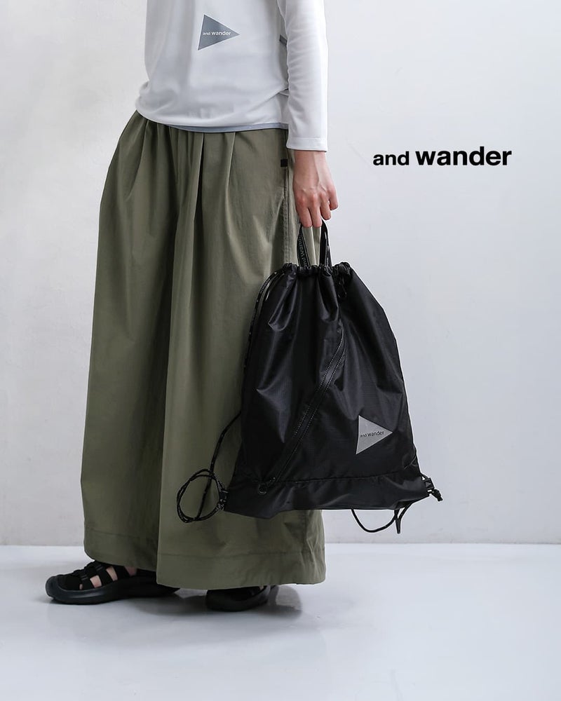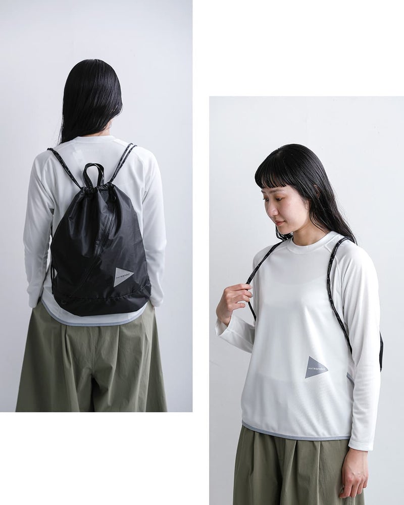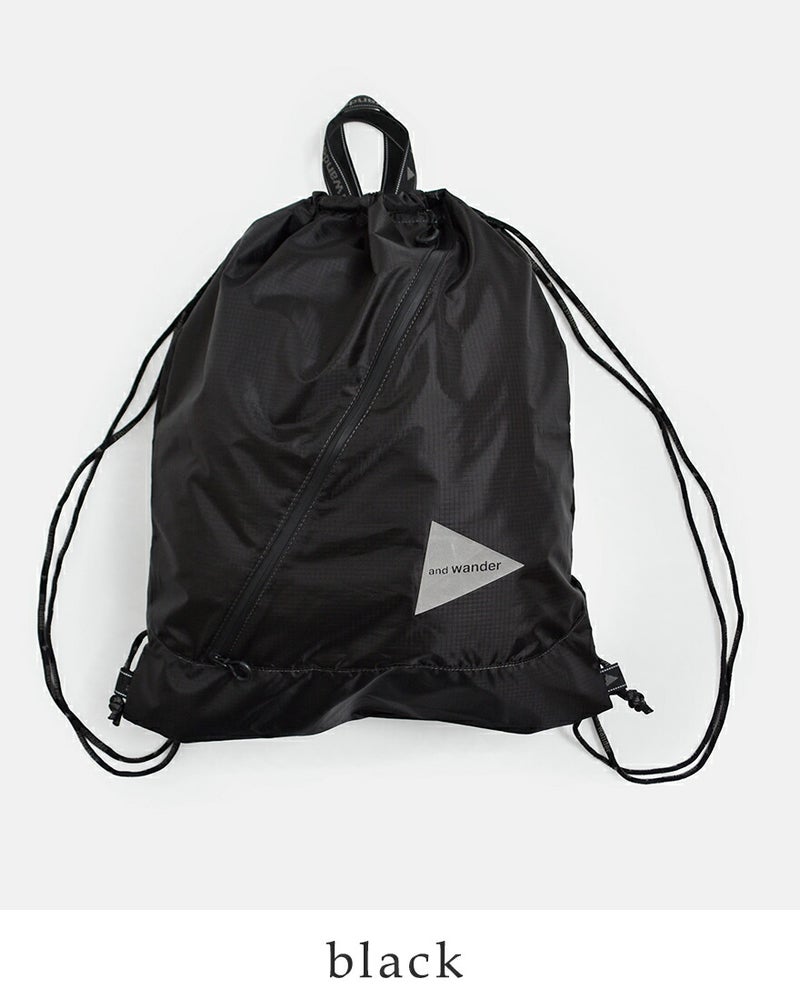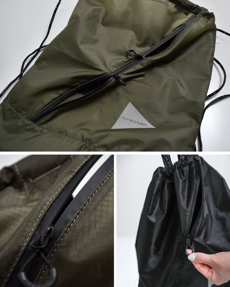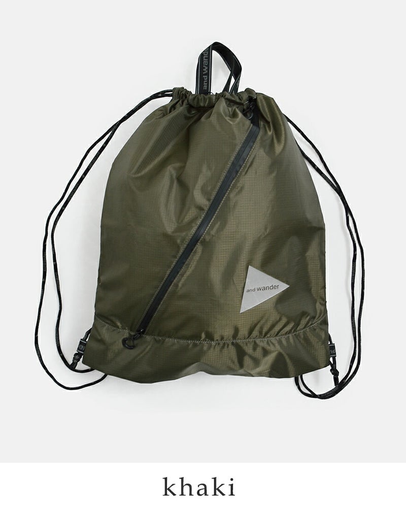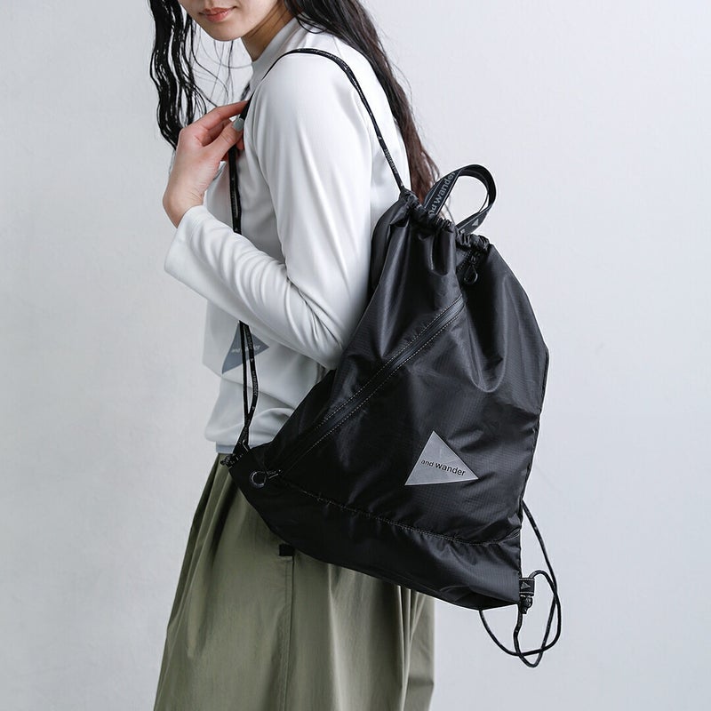 and wander(アンドワンダー)より、クリスピーリップドローストリングバッグ crispy rip drawstring bagのご紹介です。ポリエステルリップ素材を使用したドローストリングバッグ。コードを用いて背中に背負うこと、内側のハンドルを出してトートバッグとして使用することができます。斜めのジップで簡単に内部にアクセスできます。