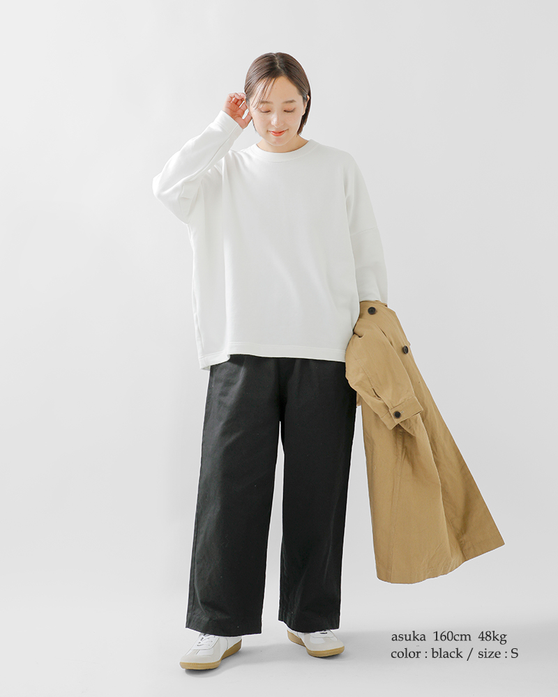 TRAVAIL MANUEL(トラバイユマニュアル)より、コットンルアンチンチノベースパンツのご紹介です。体のラインを拾わないハリのあるチノ生地を使用したリラクシンなワイドパンツ。ワイドシルエットながら緩やかにテーパードをかけ、脚を美しく見せます。ワイドながらもスッキリ綺麗なシルエットを楽しめるチノパンツに仕上がりました。
