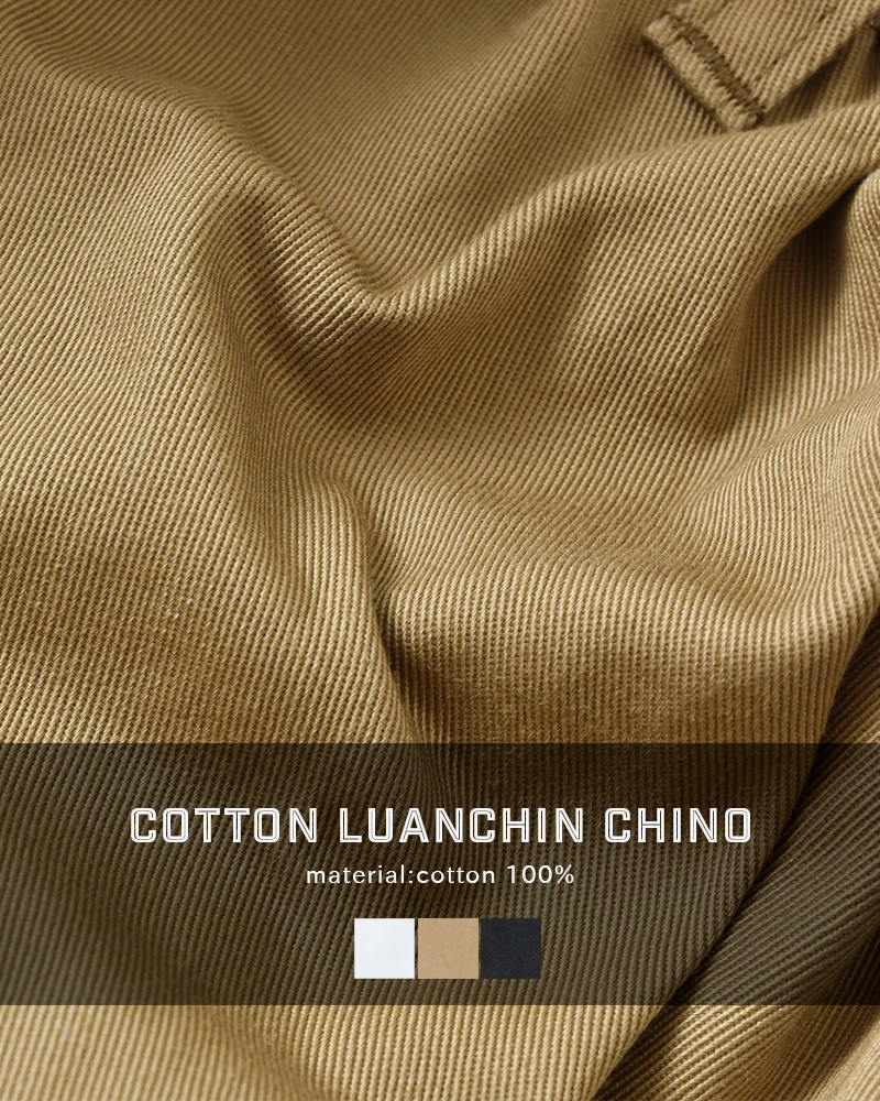 目の詰まった程よい厚みで、丈夫なチノ素材を使用しています。ハリがあり穿く度にやわらかく肌に馴染んでくれる素材で、どんな季節にも愛用できるアイテムです。