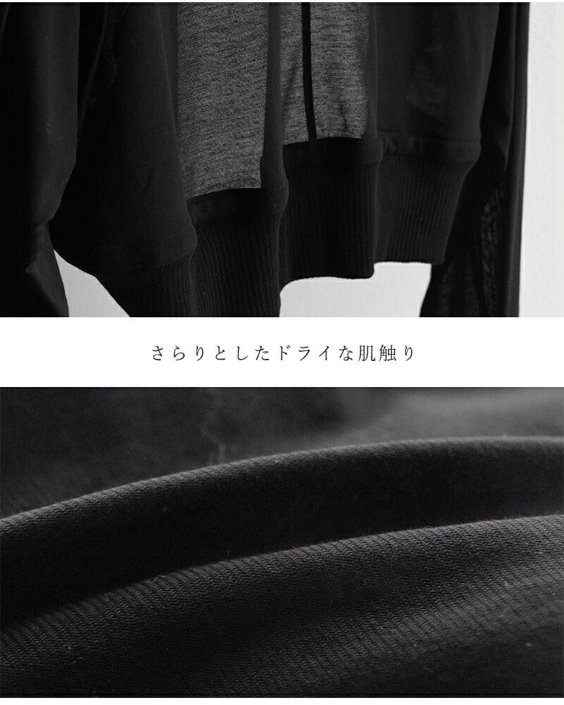 身幅にたっぷりと余裕を持たせたドルマンシルエット。 身体のラインを包み込むようにカバーしつつ、動くたびに自然なドレープが生まれ、リラックス感の中に上品さを感じさせます。