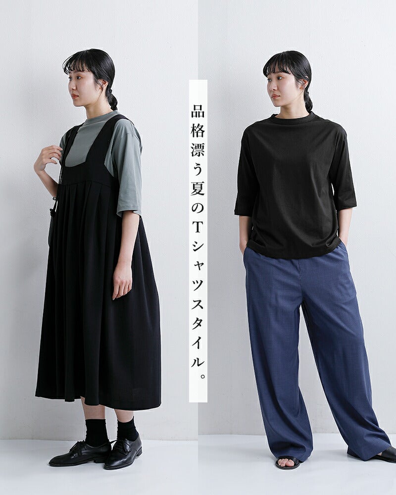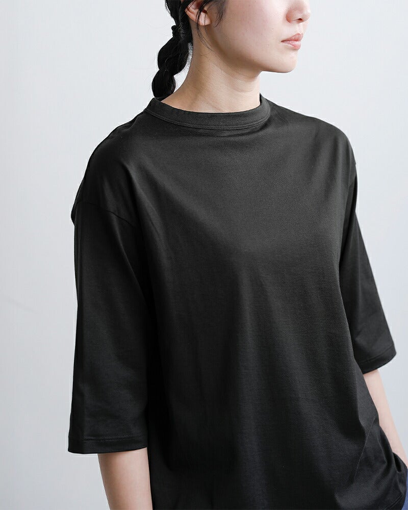 肘を隠す絶妙な6分袖は、リラックス感がありながらも二の腕をスマートにカバー。Tシャツらしい気軽さと、上品なブラウスのような汎用性を兼ね備えた一着です。