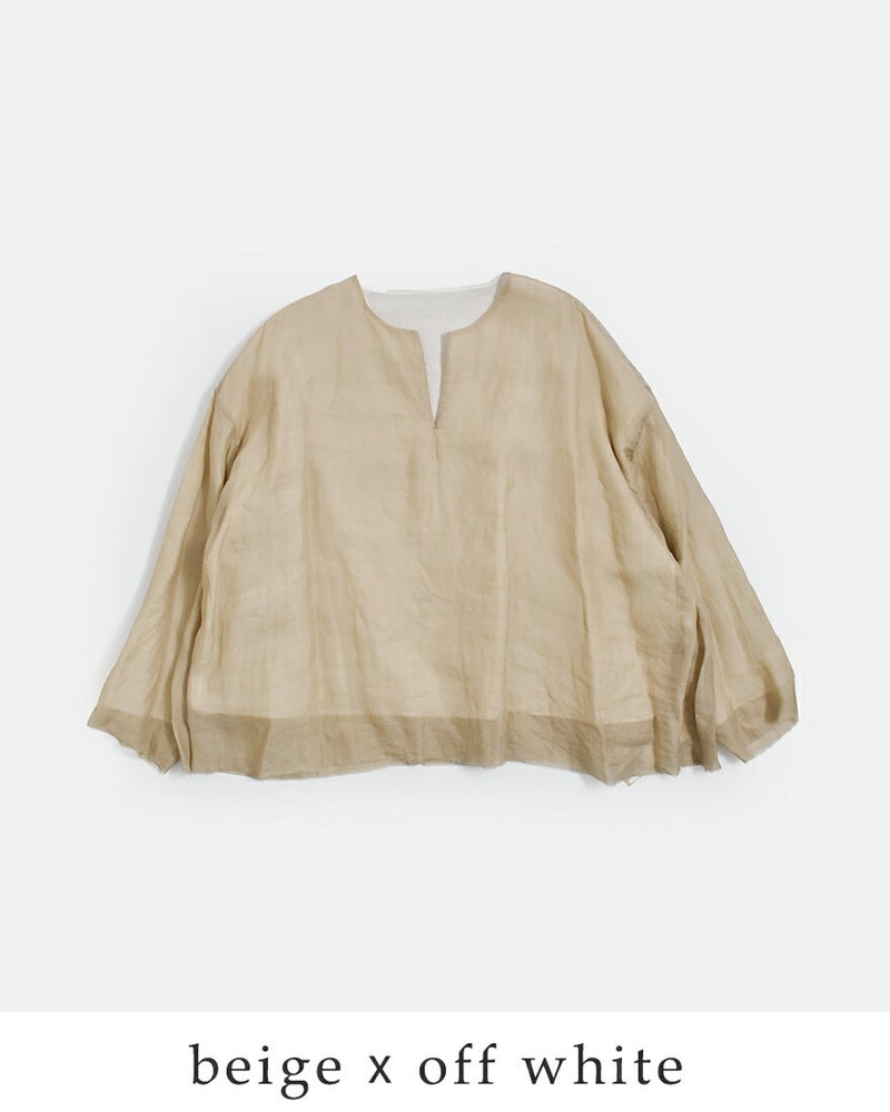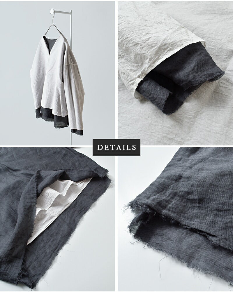 ●裏返すと、切りっぱなしのディテールがさりげなく覗くクールな佇まいに。 ●表地は透け感のある素材ですが、裏地との組み合わせにより、一枚でもさらりと着用いただけます。