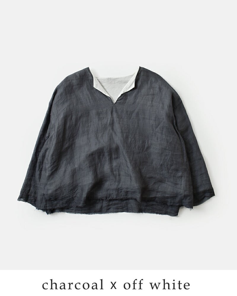 HAVERSACK(ハバーサック)より、ラミーツイル リバーシブル プルオーバーシャツのご紹介です。 エッジの効いたディテールが印象的なプルオーバーシャツ。 すっきりとしたVネックラインに切りっぱなしの仕様を組み合わせることで、程よくモードな雰囲気を纏える一着に仕上げられています。 裏表をひっくり返すことでリバーシブルで着用可能。 表情の異なる2つの面を楽しめるため、その日の気分やスタイリングに合わせた着こなしが叶います。 ラミー素材特有の軽やかさとシャリ感があり、季節の変わり目にも心地よく取り入れられるアイテムです。