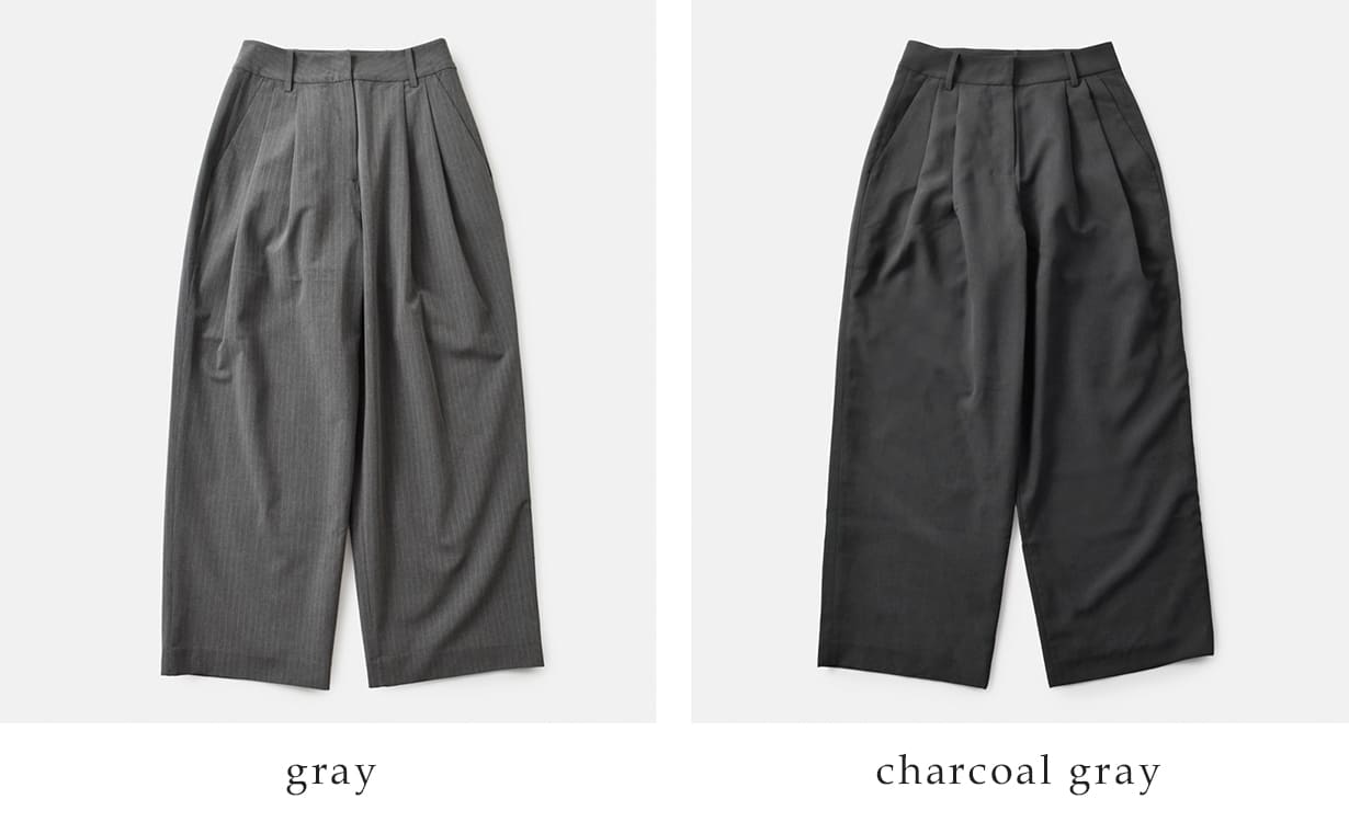 ストレッチ性のある平織りの杢調素材で仕上げたワイドパンツ。ダブルタックデザインで、シンプルなディテールとこなれ感の出るラフなシルエットが、コーディネートの幅を広げてくれる一本。しわになりにくく、肌触りが心地良い点も魅力。同素材のCollarless Over Jacketとセットアップで着るのもおすすめ。グレーは細ラインのストライプ素材。チャコールグレーは少しブルー味のあるなんとも言えない絶妙な色合いで、着るだけで洒落感の出るカラーです。
