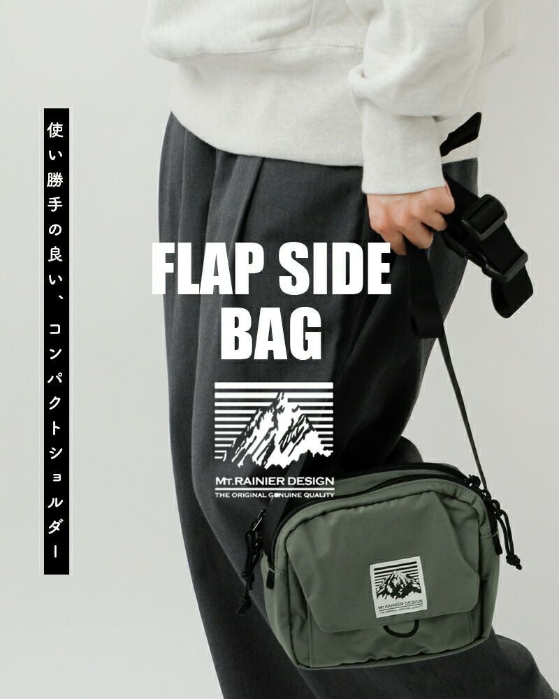 MT.RAINIER DESIGN(マウントレイニアデザイン)より、フラップサイドショルダーバッグ“FLAP SIDE BAG”のご紹介です。使い込むほどに味わいの出る綿ナイロンの混紡素材、通称ロクヨンクロスを使用した、コンパクトで使いやすいショルダーバッグ。複数の収納ボックスが搭載され、貴重品を整理して収納ができます。サブバックとしてやフェスなどにも最適なショルダーバッグです。