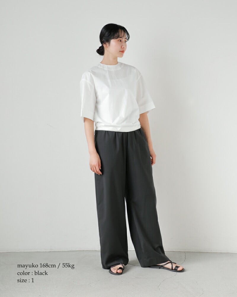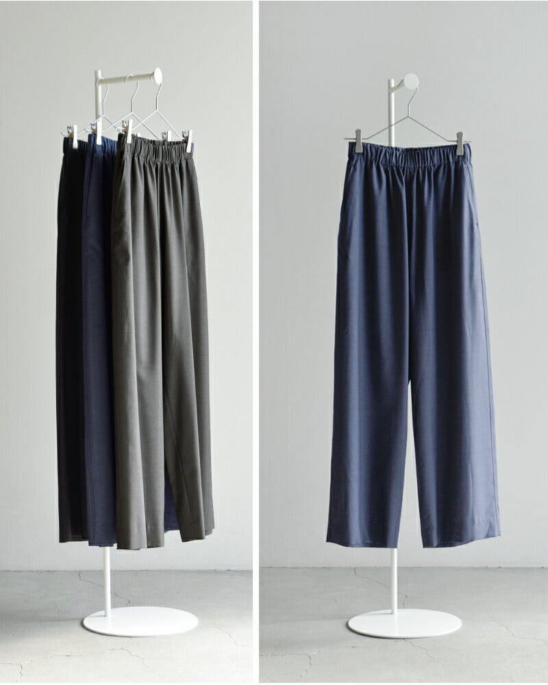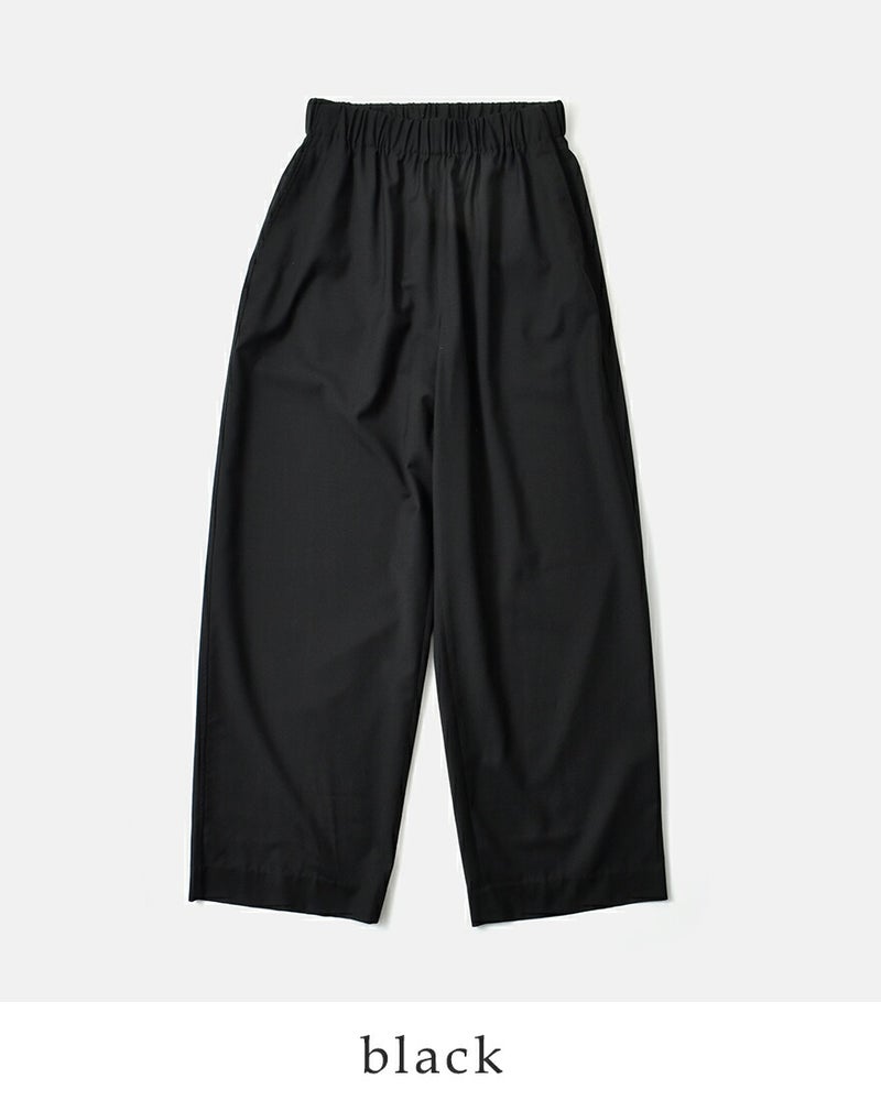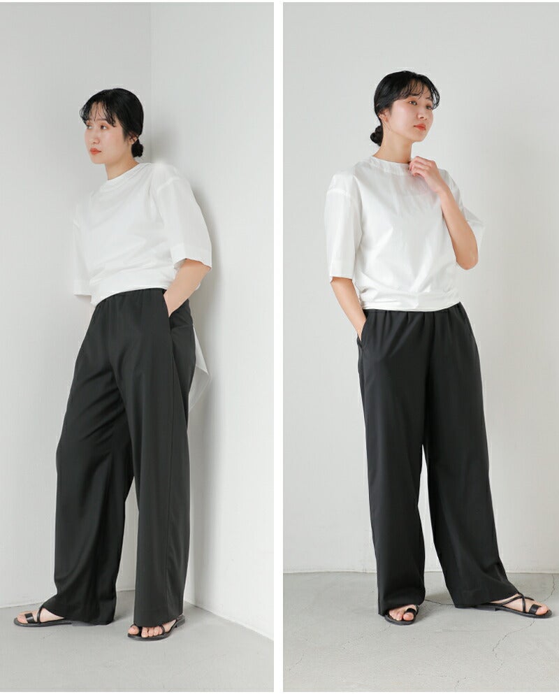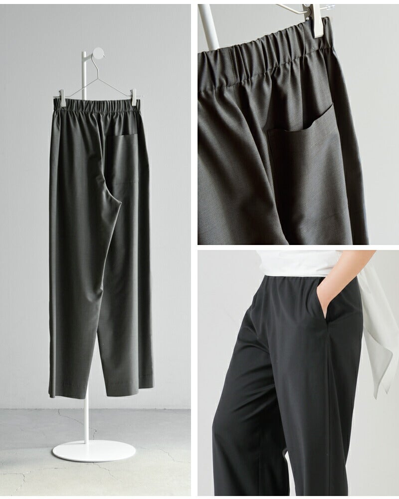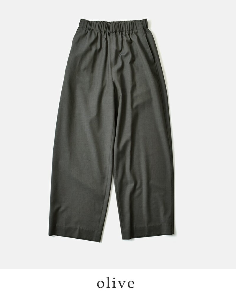 ウエストゴム仕様でリラックスした穿き心地ながら、素材の上質さと計算されたボリュームで、ラフすぎない洗練された雰囲気が楽しめる一枚です。