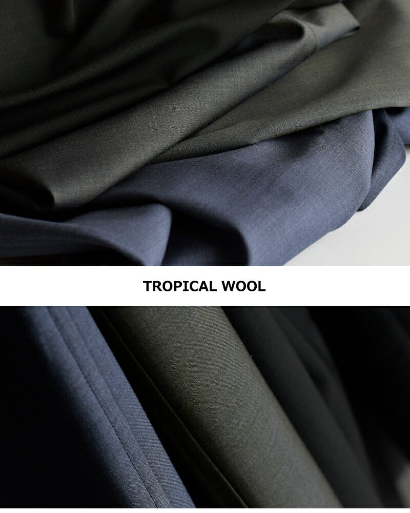 通気性がよく、ウールながらも軽快な着心地が特徴。しっとりとした肌当たりと自然な光沢感があり、動くたびに美しいドレープを描きます。春先から、夏、秋へと移り変わる時期にちょうどいい着用感。蒸れにくくドライな肌触りで、長時間の着用でも美しい印象をキープします。