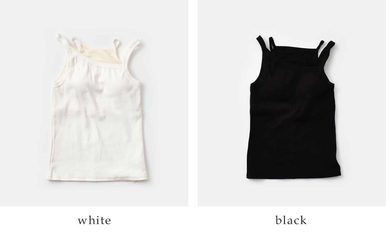 2枚が重なるようにデザインされたシアーキャミ風のレイヤード。視線を引きつけるポイントに。