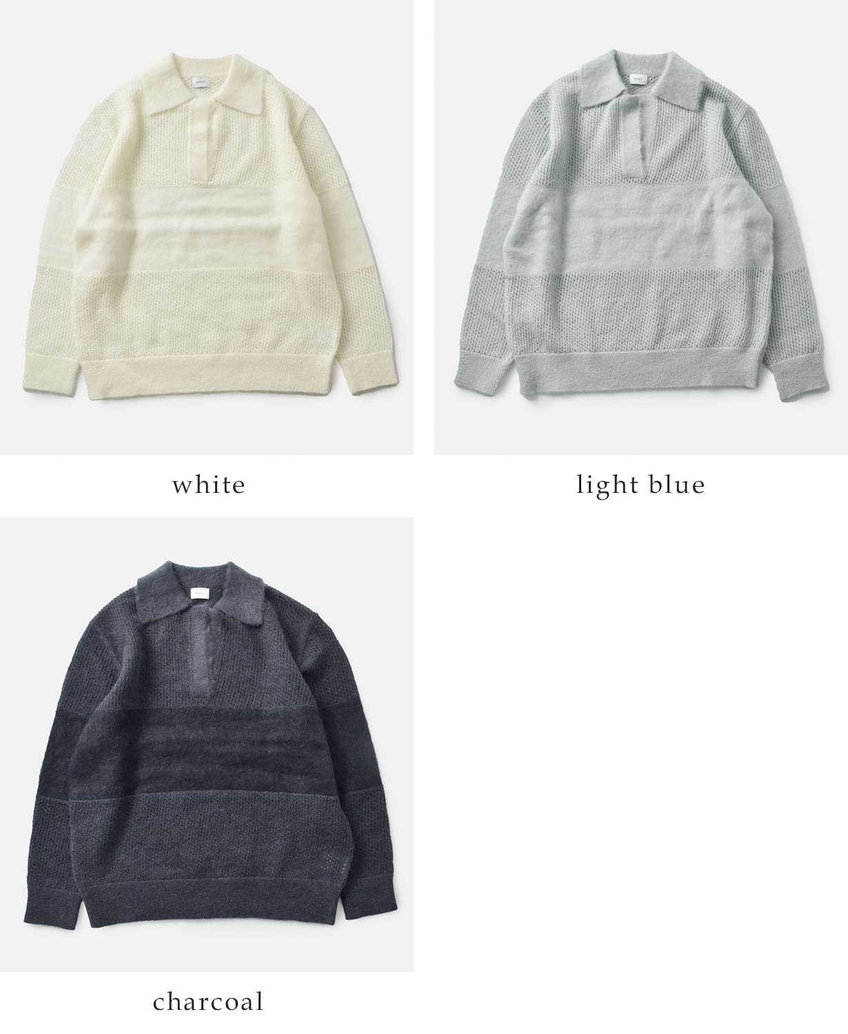 毛足の長いモヘア混の糸を使用し、天竺編みと透かし編みを組み合わせたポロニット。メンズライクになりがちなポロカラーも、透け感のある編み地を組み合わせることで、スポーティさを削ぎ落とし大人の女性らしい印象に。デコルテが見えるくらいのほど良く深めのフロントスリットデイテールに、ルーズなオーバーサイズシルエットとの絶妙バランス。ニュアンスカラーが深みのあるスタイリングに。秋口はキャミソールなどのインナーを合わせて、冬はハイネックを入れてレイヤードを楽しんでいただくのもおすすめです。
