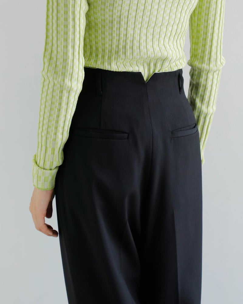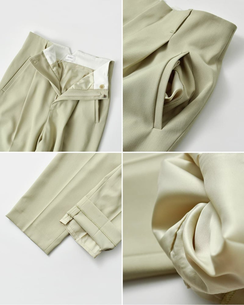 裾にかけて細身になるテーパードラインによりすっきりとまとまった裾。
