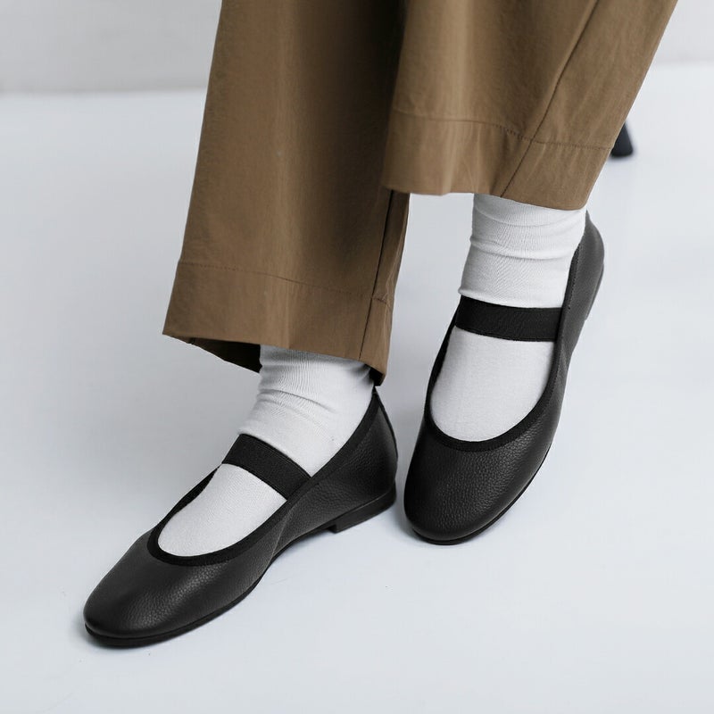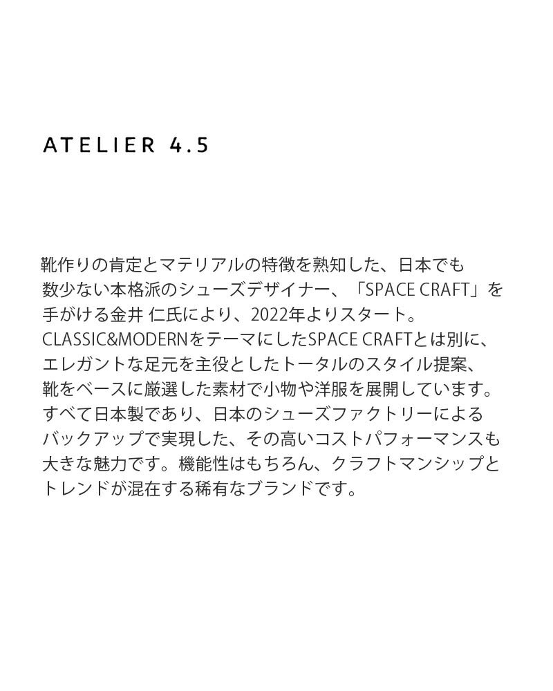 ATELIER 4.5(アトリエ4.5)よりシュリンクレザー ワンストラップ バレエシューズのご紹介です。レザーの質感を素肌で感じるような、極上の柔らかさが魅力のバレエシューズ。アッパーは牛革のシュリンクレザーを使用。バレエシューズをデザインソースにアンライニング(裏なし)先芯、カウンターをなくし、柔らかい履き心地を追及した一足に仕上げました。