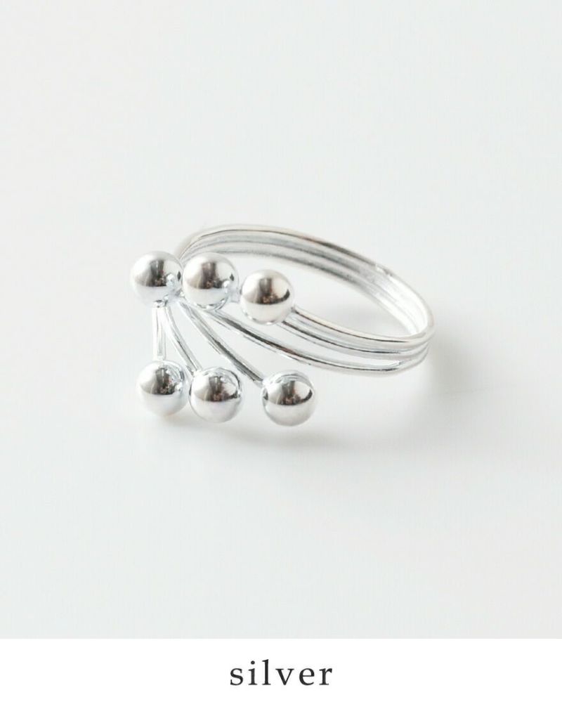ボールを支える本体はシルバーのコードが三重になったユニークな構造。一本一本がそれぞれのボールに取り付き、カーブを微妙に変えながらバランス良くまとめられています。シルバー925素材なのでじんわり力を加えて指のサイズにフィットさせることができ、お好みの指での着用が可能です。