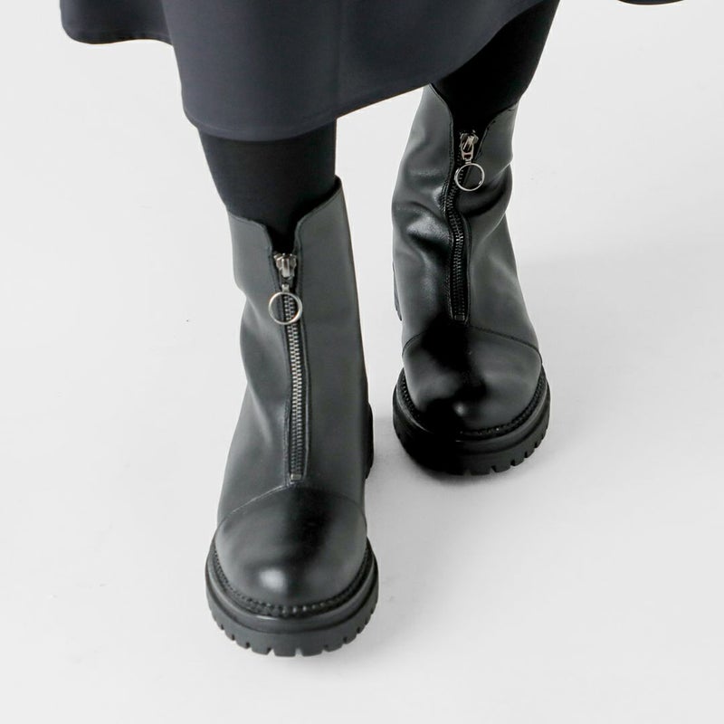 ブーツのフロントには、大胆に配されたセンタージップを採用。無駄を削ぎ落としたシンプルなシルエットの中で、
