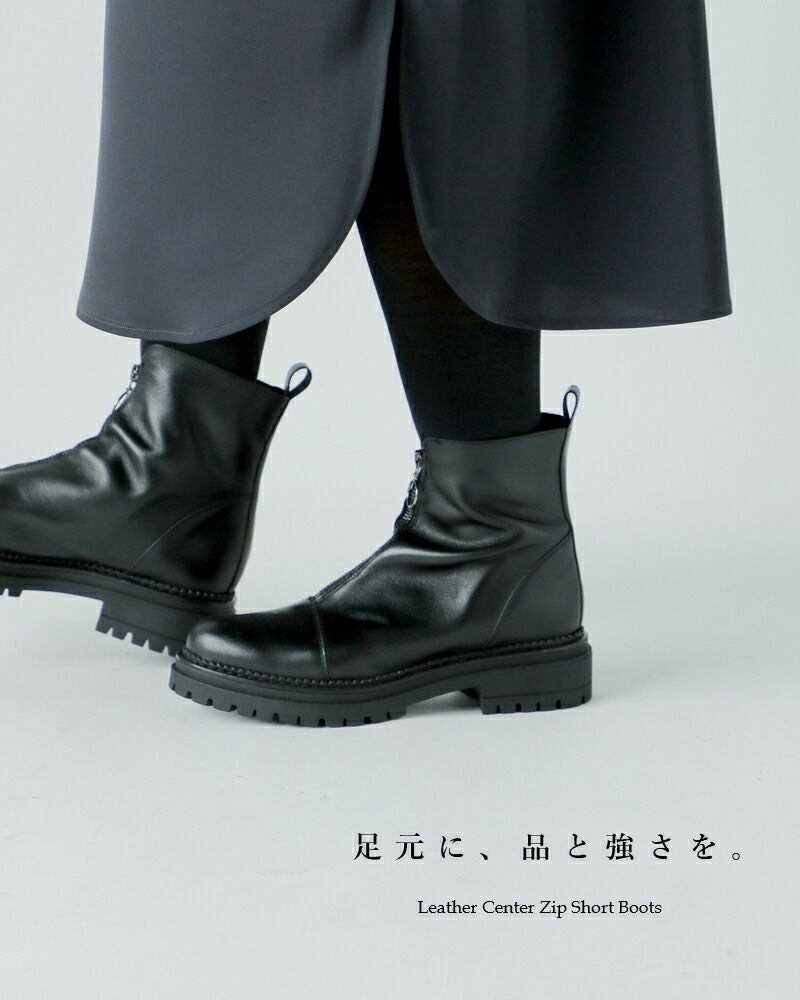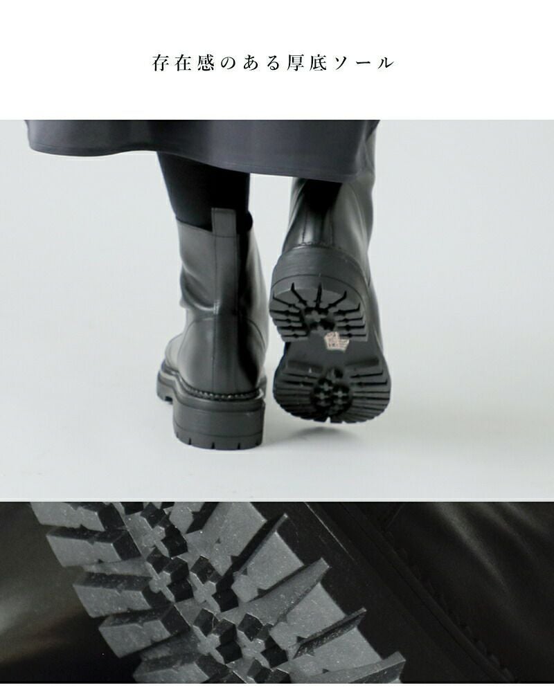 KMB(ケーエムビー)より、レザーセンタージップショートブーツのご紹介です。ブラックのレザーがモードで重厚感のある雰囲気ながら、センタージップで程よくカジュアルさをプラスしたショートブーツ。存在感のある厚底ソールですが、ショート丈で足元が重たくなり過ぎません。ブラック1色の潔さが、大人のスタイルにぴったり。スカートにもパンツにも合わせやすく、一足でコーデがキマる「主役級ブーツ」です。