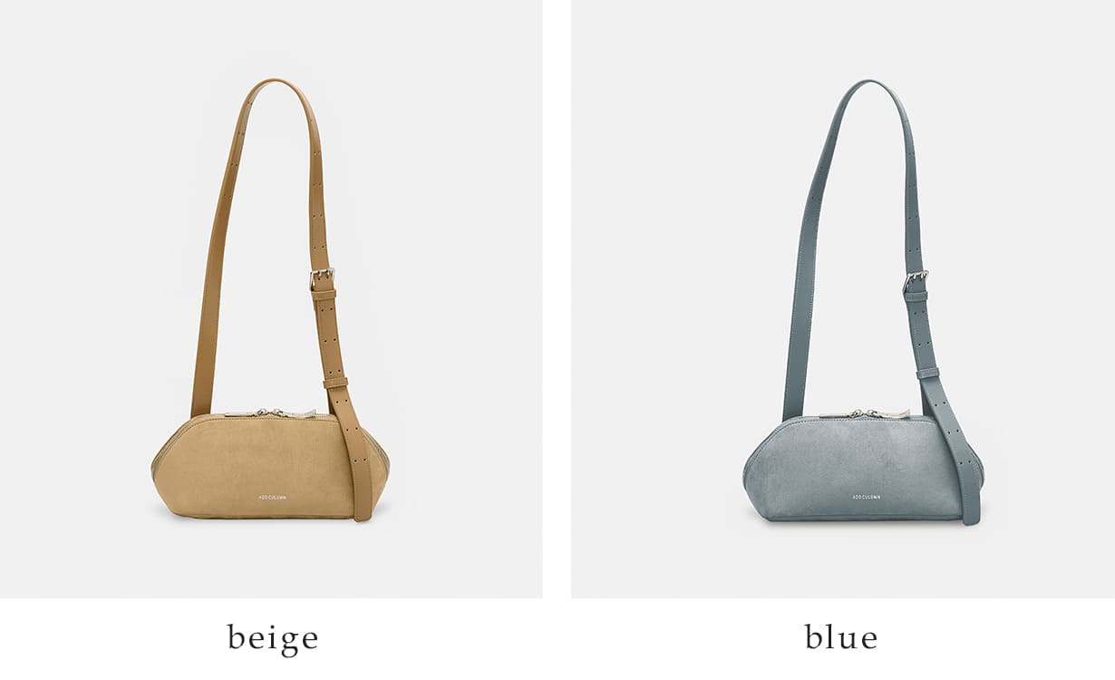 長さ調整可能なショルダーストラップにより、肩掛けから斜め掛けまで、シーンやスタイルに合わせた使い方が楽しめるバッグです。カラー展開は柔らかく上品なベージュと淡い雰囲気のブルーの2色をご用意いたしました。