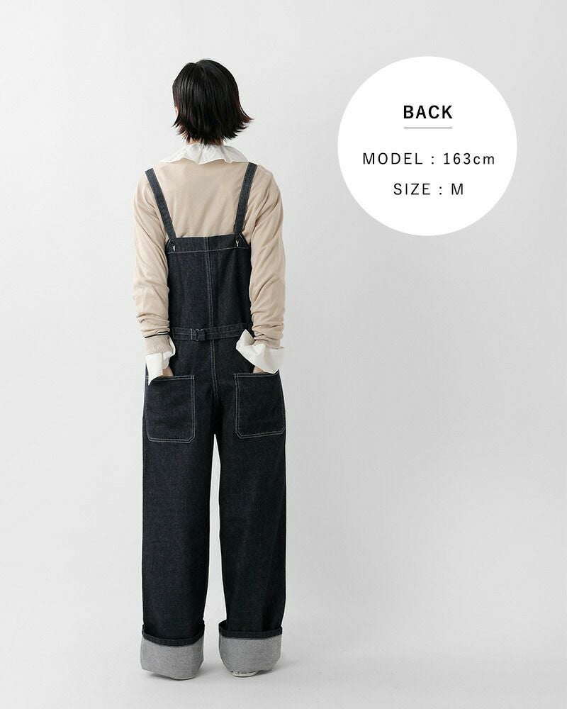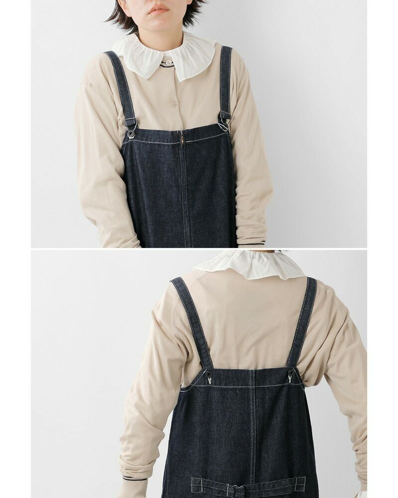 吊りカンで簡単に取り外せるショルダーは長さ調整も自由自在。模様入りのボタンがアクセントになっています。ウエストの尾錠をシェイプすれば、女性らしいシルエットで着こなせます。デニム生地に白のステッチが映えるデザイン。