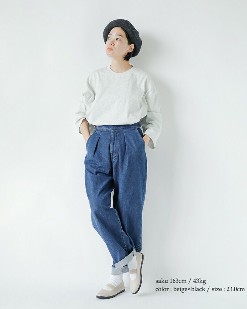 優しいフォルムのラウンドトゥ。甲をしっかりとホールドしてくれるゴムストラップは着脱もラクチンです。甲高さんも圧迫感なく履けます。インソールは起毛のある素材で素足でもさらっと心地よく履いていただけます。バックには着脱をサポートしてくれるタブ付き。タブ部分は生地を切り替え、さりげないアクセントに。