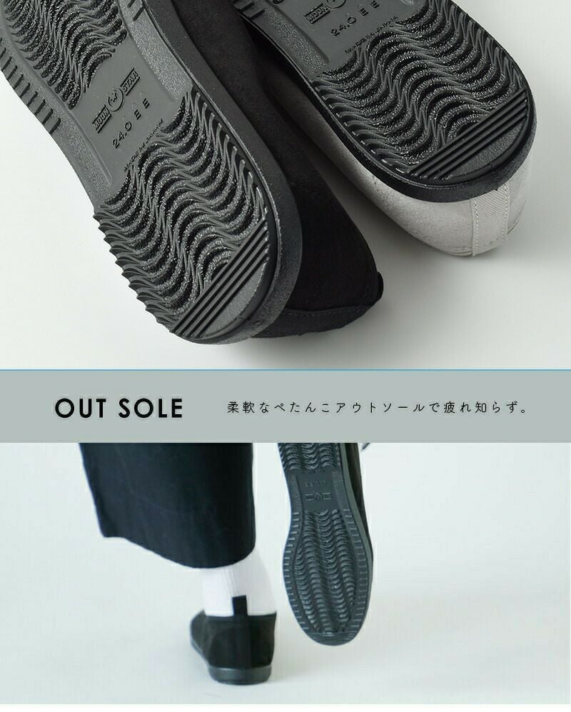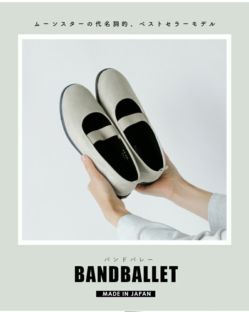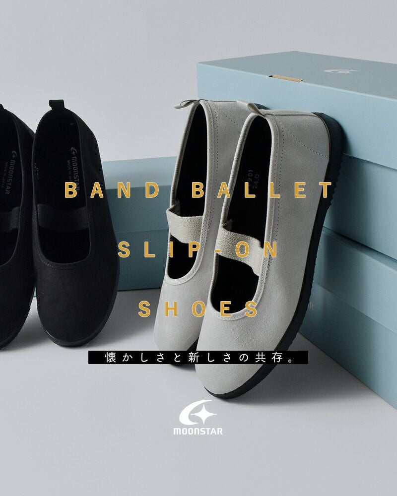 Moonstar(ムーンスター)より、バンドバレースリッポンシューズ“BAND BALLET”のご紹介です。ムーンスターの代名詞とも言えるデザイン「学生用の上履き」をベースに素材やカラーを一新させることでパンプスの様な女性らしい雰囲気に。マットな質感のヌバック仕様のシンプルなアッパーにゴムのバンドとミニマルなデザインなのでいろんなコーデに合わせることができます。