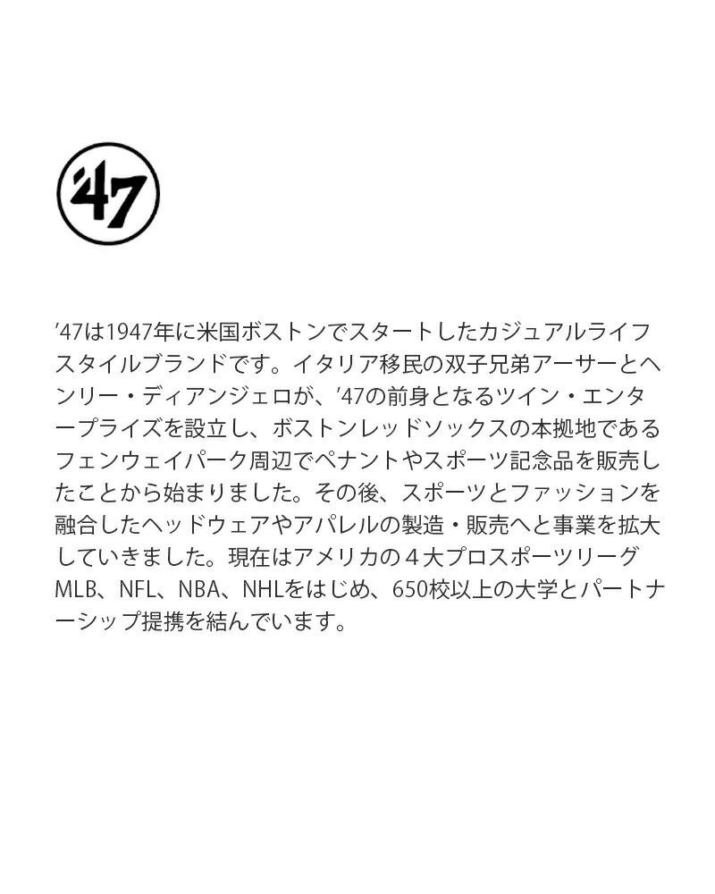 ’47は1947年に米国ボストンでスタートしたカジュアル ライフスタイルブランドです。 イタリア移民の双子兄弟アーサーとヘンリー・ ディアンジェロが、’47の前身となるツイン・ エンタープライズを設立し、ボストンレッドソックスの 本拠地であるフェンウェイパーク周辺でペナントや スポーツ記念品を販売したことから始まりました。 現在はアメリカの4大プロスポーツリーグ MLB、NFL、NBA、NHLをはじめ、 650校以上の大学とパートナーシップ提携を結んでいます。