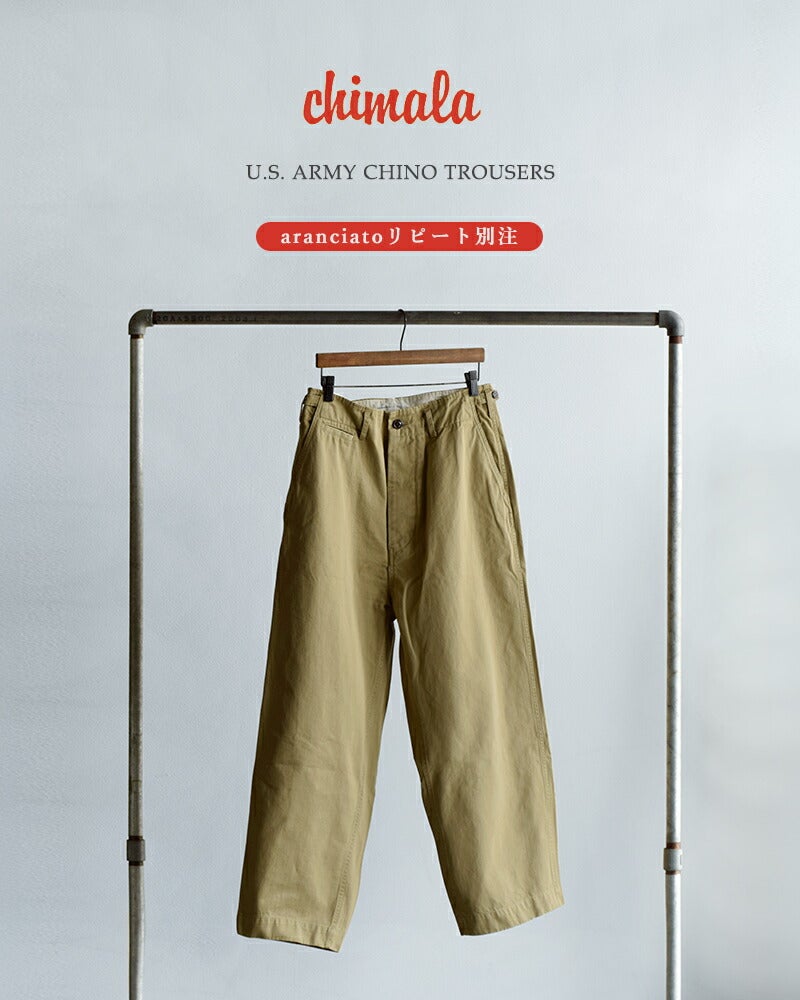 chimala(チマラ)より、USアーミー チノ トラウザーパンツ shorterのご紹介です。chimalaらしいヴィンテージ解釈が光る、USアーミー由来のチノトラウザーパンツ。無骨なミリタリーの空気感をベースにしながらも、現代的に再構築されたシルエットは、ラフすぎず上品さを感じさせるバランスに仕上がっています。長年穿き込んだような風合いと、日本製ならではの丁寧な作り込みが融合した一本。日常に自然と馴染みながらも、確かな存在感を放つチノパンです。再販を望む多くの声を受け、今回特別にリピート生産が実現しました。